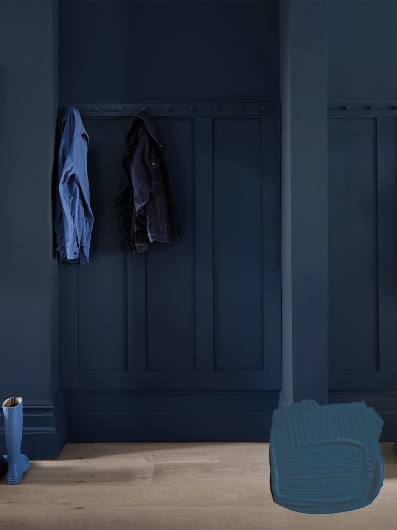 This strong blue takes its name from the fantastically coloured woodwork used by the Dutch. It works on ground skirtings or as an accent colour on the walls when teamed with Borrowed Light. The green undertones of this deep and dramatic blue mean it sits as happily outside as it does in small, dark rooms.