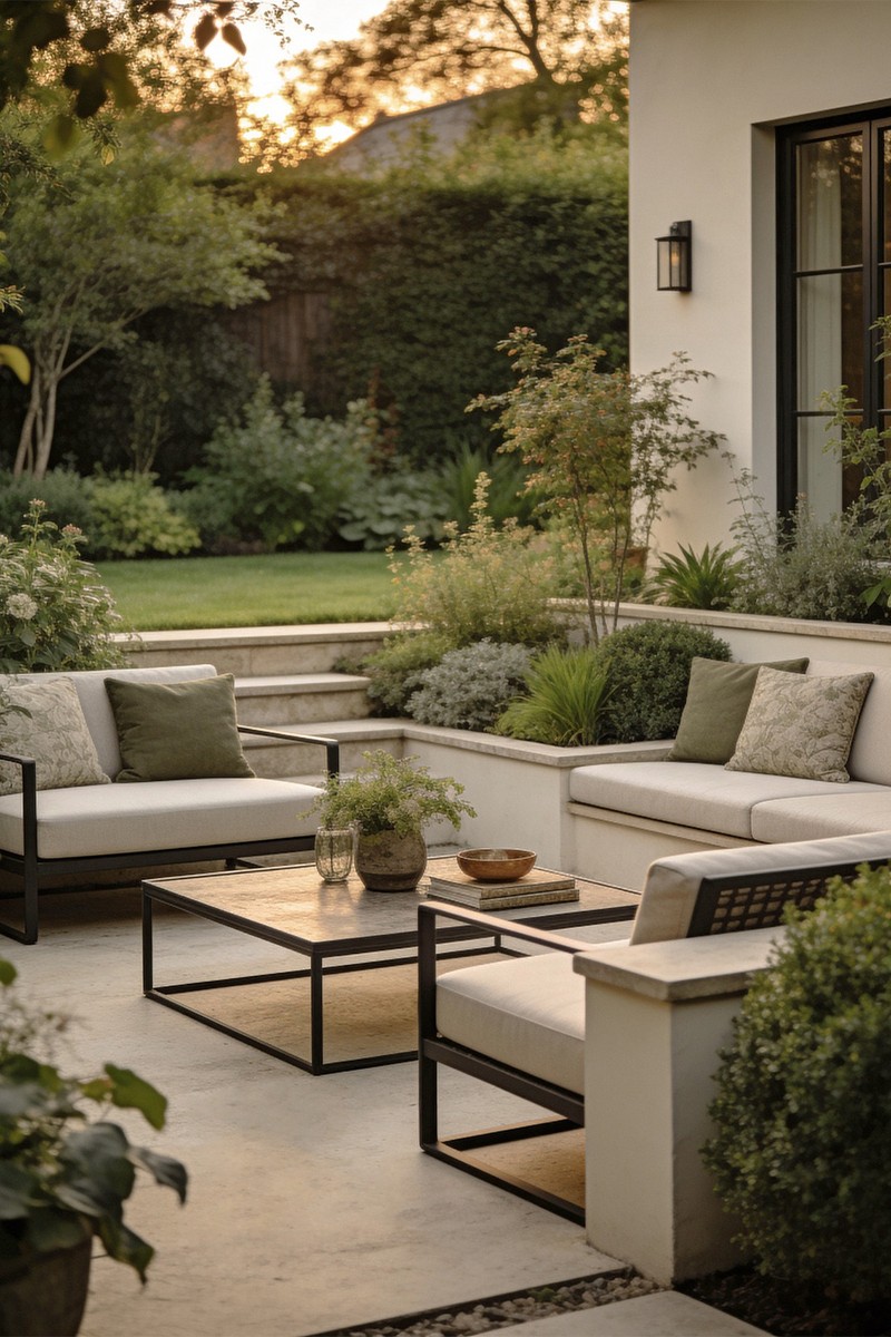 Our key design principle was restraint. A palette of limestone, dark steel, sage and warm white, used consistently from the hard landscaping right through to the cushions. The bilateral rhythm in the seating arrangement creates order without tipping into anything too formal. And proportion: everything is scaled to feel generous rather than empty.