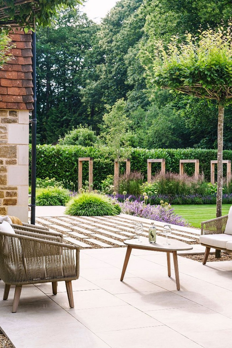We mindfully chose a traditional palette. Natural limestone paving felt appropriate – something that will weather gently over time and sit comfortably with the architecture. For the fencing, we chose a timber-effect composite for durability and its softer, more natural appearance. The rest of the materials were defined by lush and verdant planting