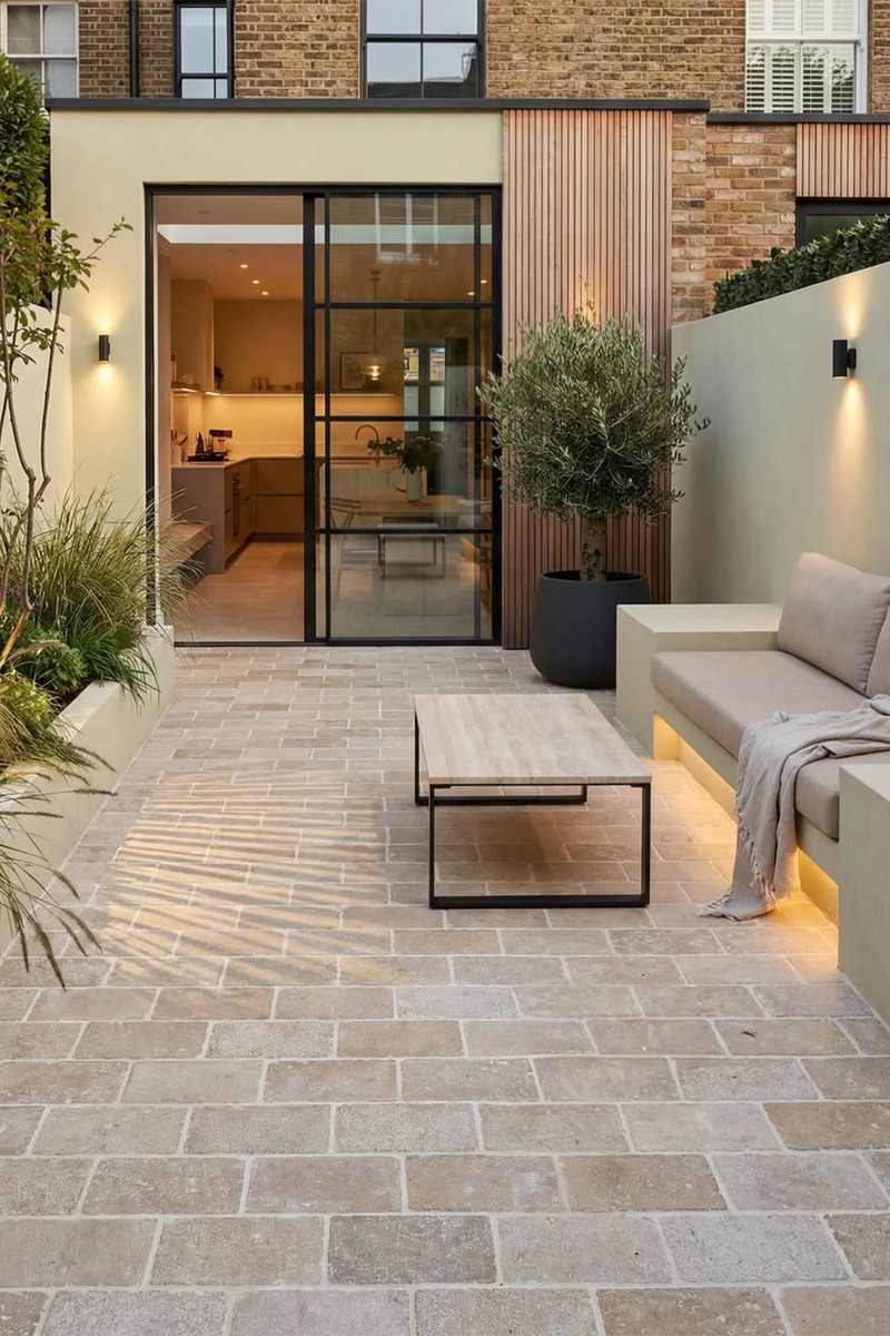 Keeping everything aligned and uncluttered made a big difference. The continuous paving helps the space feel longer, and having the large doors at the end draws your eye through from the house into the courtyard. The lighting also helps in the evening, as it softens the edges rather than highlighting how narrow it is.