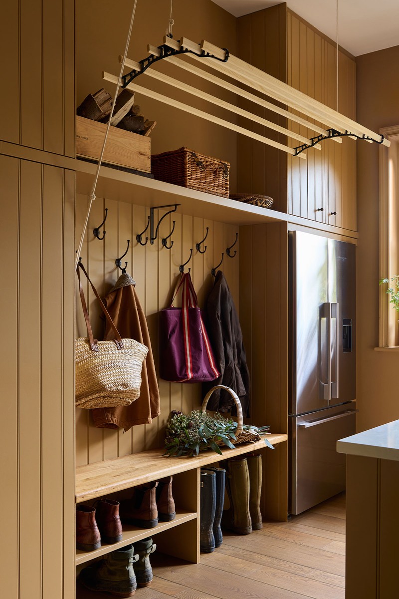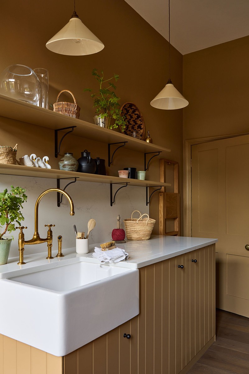 This room works extremely hard for a family of five – laundry, coats, wellies, sports kit, cleaning supplies. We chose a soft toffee tone for walls and joinery, while deVOL glazed pendants offer stylish, functional overhead lighting.