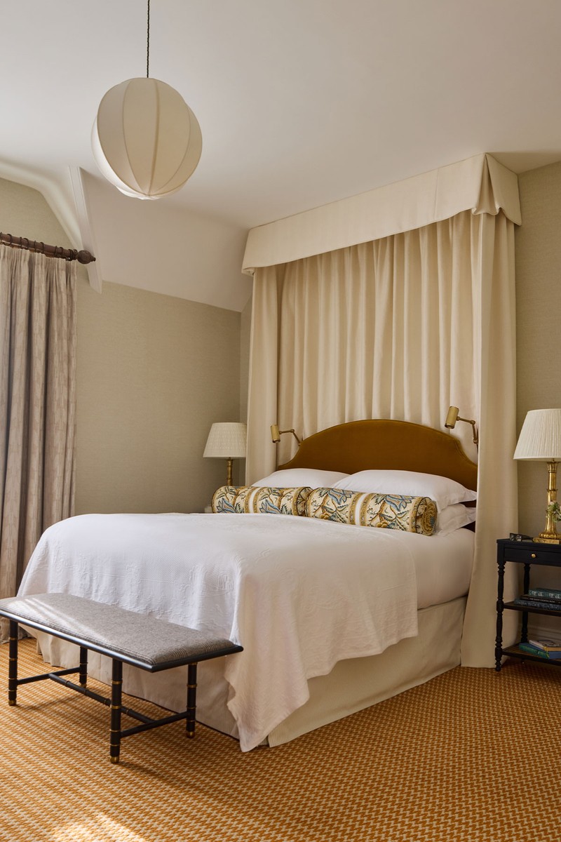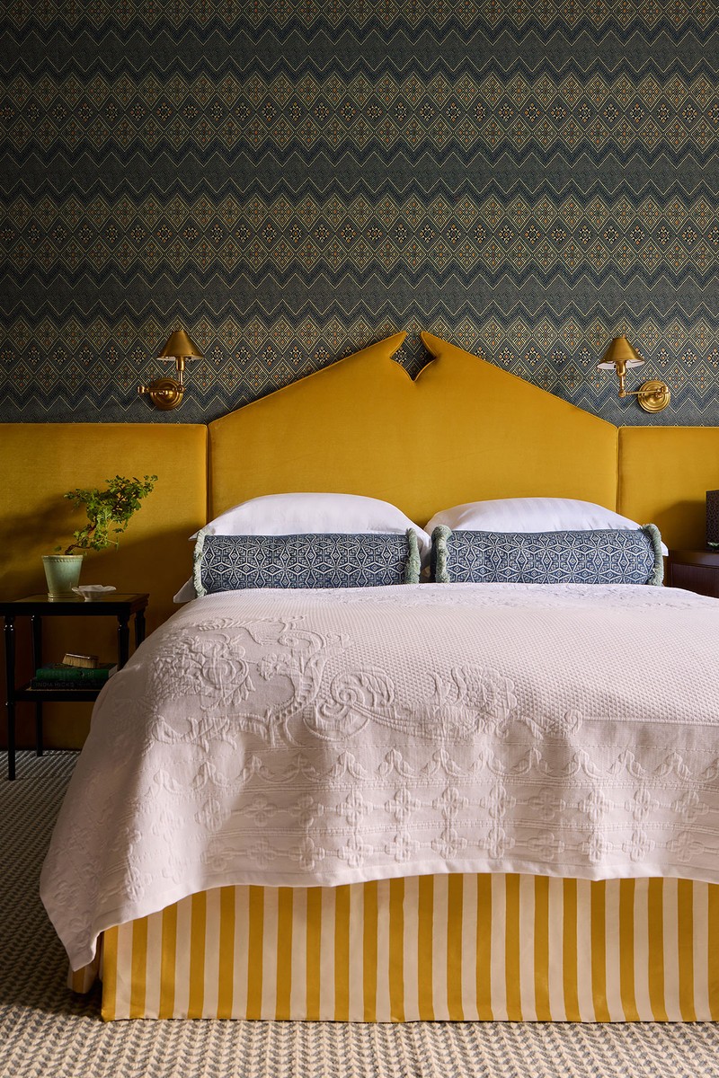 On the first floor, this room has a generous desk that doubles as a dressing space – which is useful for guests or as an extra quiet space for the family. The geometric wallpaper sets the tone for the scheme: deep green, navy and ochre. A full-length upholstered headboard in deep yellow velvet grounds the room, while off-white herringbone curtains keep the palette balanced and serene.