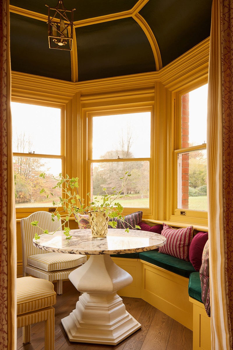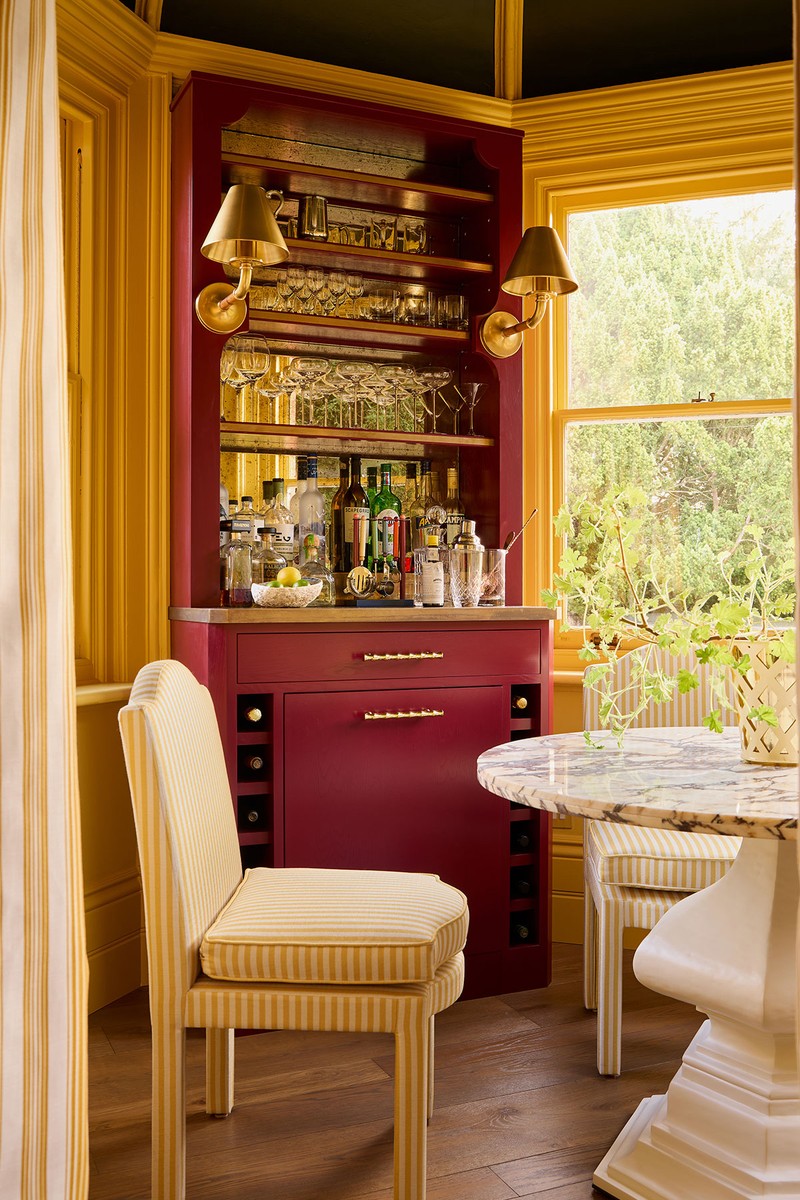 Previously an underused area that acted as a drafty through-room, we immediately saw its potential as a glamorous entertaining space. The awkward shape meant a banquette was essential to anchor the round table. Jewel tones evolve here into rich burgundy and saffron, and the Julian Chichester marble-topped table is a statement centrepiece. Brass bamboo lighting delivers evening warmth and bespoke joinery includes brass accents, antiqued mirror and bamboo hardware.
