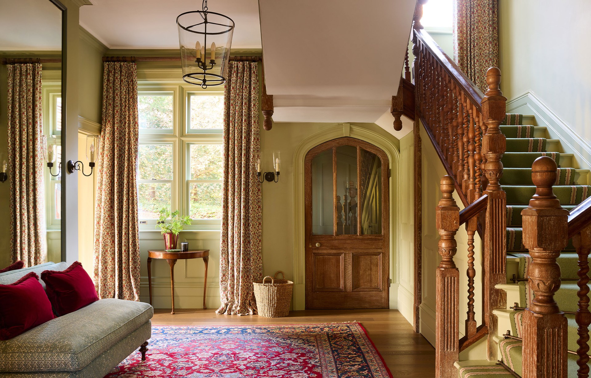 This space needed to set the tone for the whole house. We retained and celebrated the timber panelling and Arts & Crafts staircase. The muted green palette was drawn from the Soane fabric used on the curtains. A Sinclair Till runner ties the greens together with a subtle raspberry-red border. A deep burgundy slipper sofa adds depth, comfort and a moment of colour.