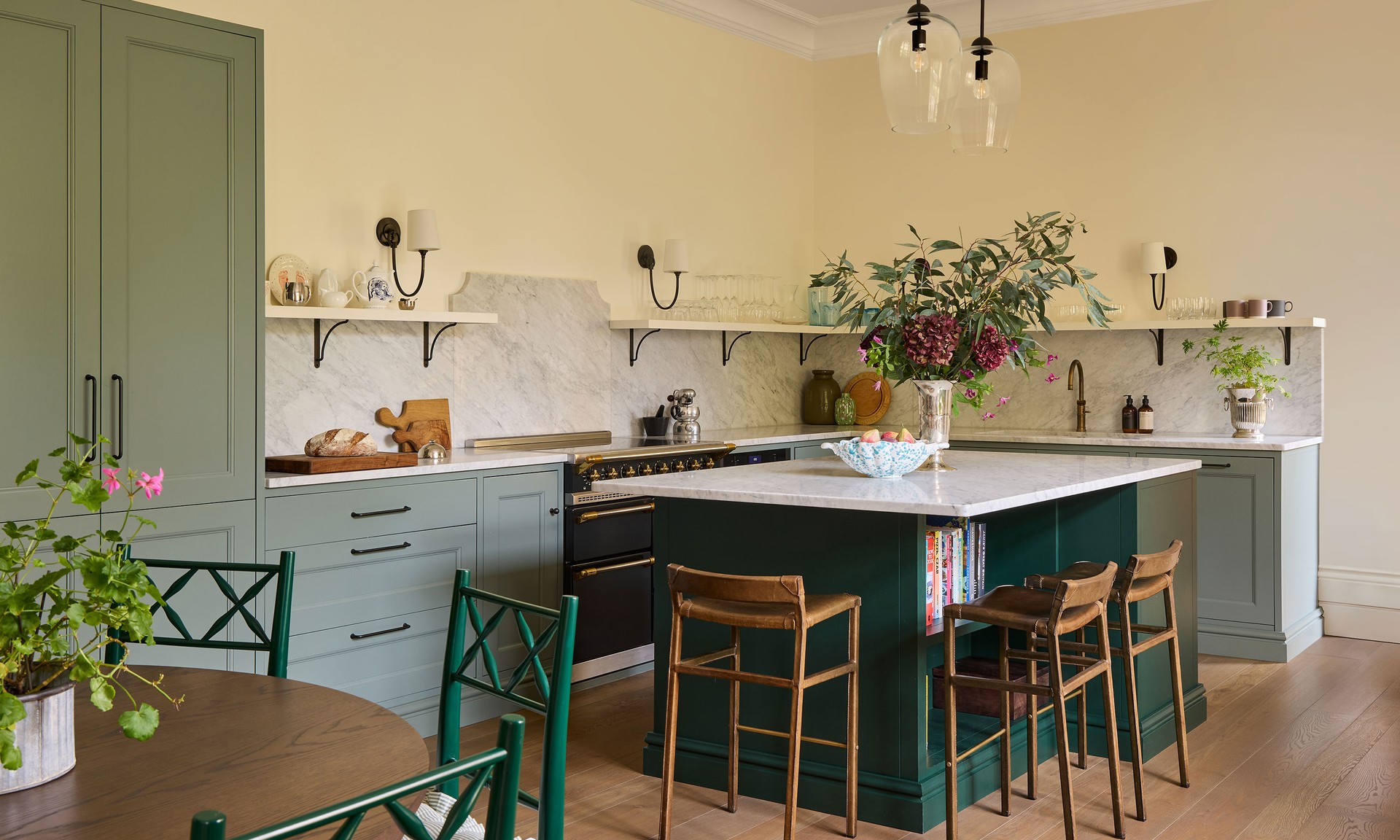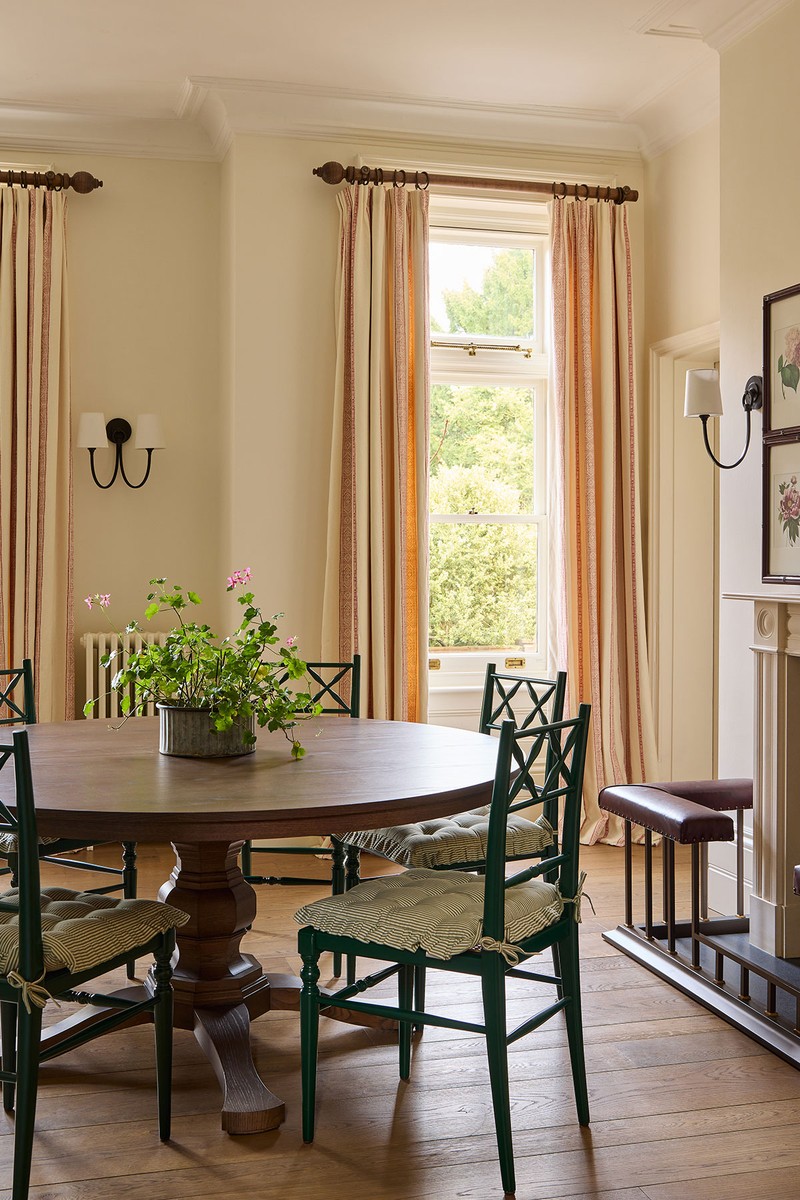 The kitchen layout remained as is but we elevated it with open shelving, marble worktops and beautiful wall lighting to keep it calm and airy. The three-metre ceilings meant high cupboards would feel wrong, so we kept the upper walls open and elegant and the green tones from the hallway continue here. We used a rich mahogany Jamb fabric on the window-front armchairs, paired with a Julian Chichester drinks trolley. Hutley & Humm designed the dining table – circular for daily family use, extending to an oval to seat up to ten.