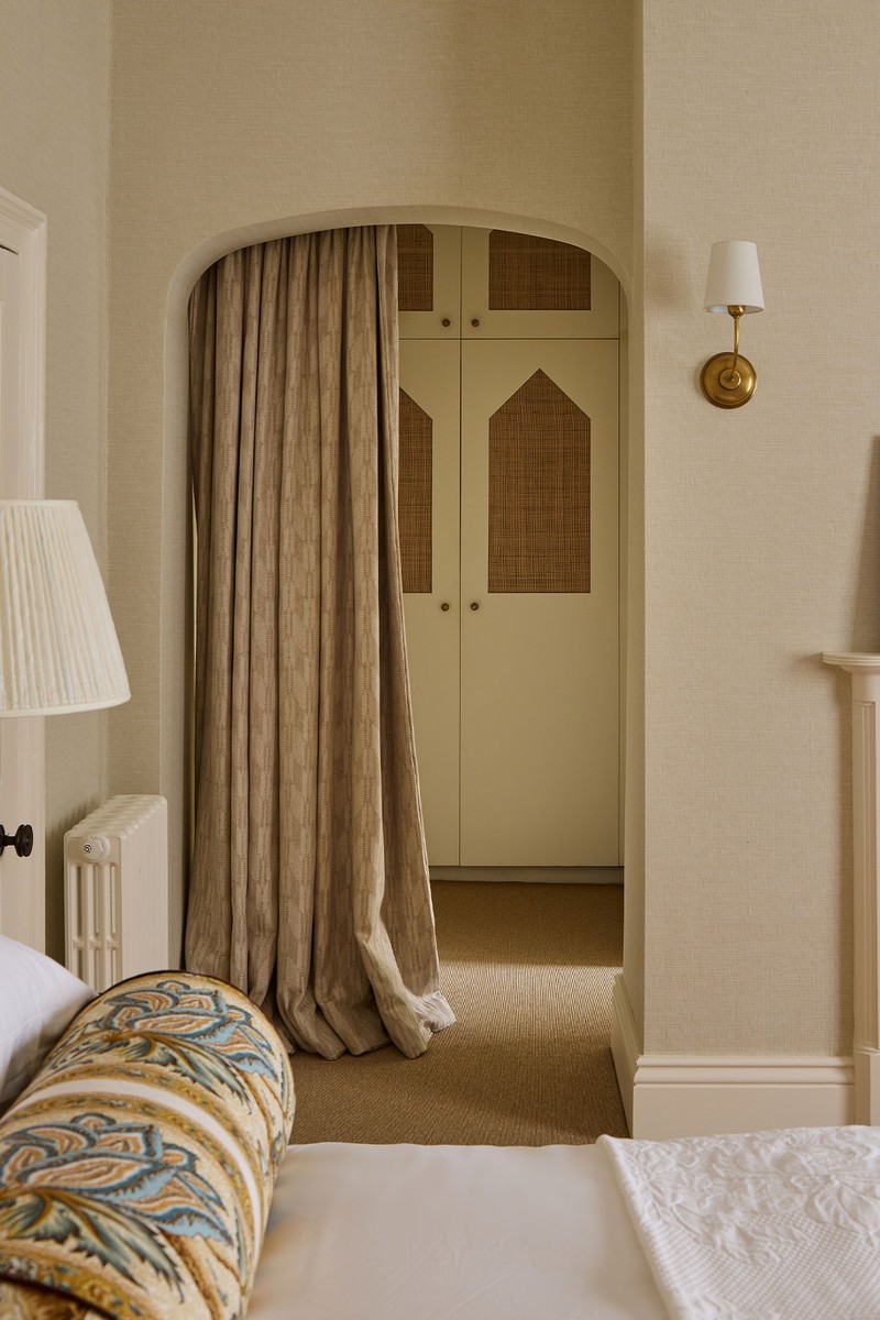 Designed as a serene retreat from busy family life, lots of soft off-whites, brass accents and gentle dusty blues keep the room feeling calm and refined. The antique dressing table and chest of drawers anchor the space and a bespoke header curtain adds a sense of quiet luxury. The white raffia Thibaut wallpaper incorporates some subtle texture and Pierre Frey’s Coral Ray fabric pulls the rust, bronze, brass, cream and blue hues together.