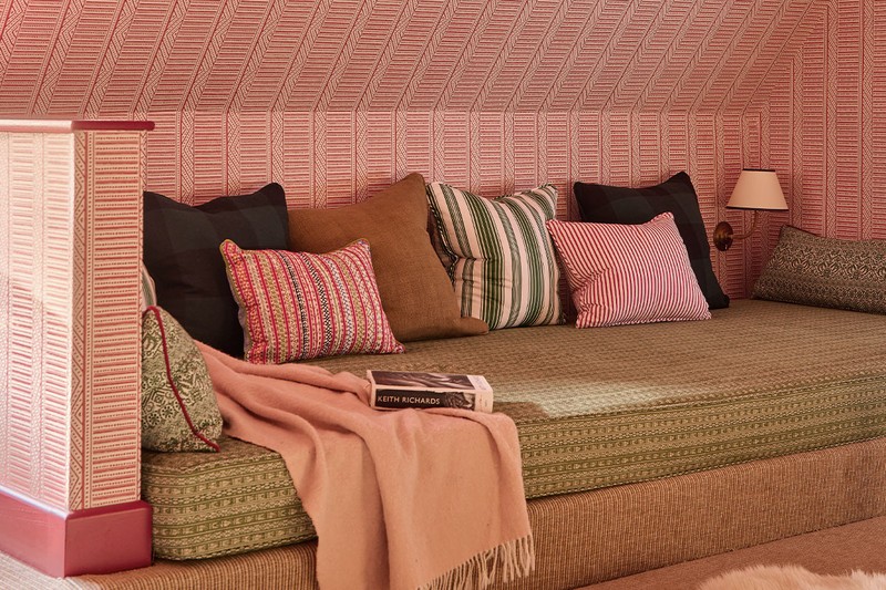 This was a particularly fun space to design. The clients wanted a flexible family-friendly zone, so we designed an under-eaves sleeping platform with a huge mattress for the children to sleep head-to-toe. The wall lights make it ideal for TV-watching, playing or reading under a duvet and the walls and ceiling are fully wallpapered in a beautiful Anna French print, transforming it into a magical hideaway.