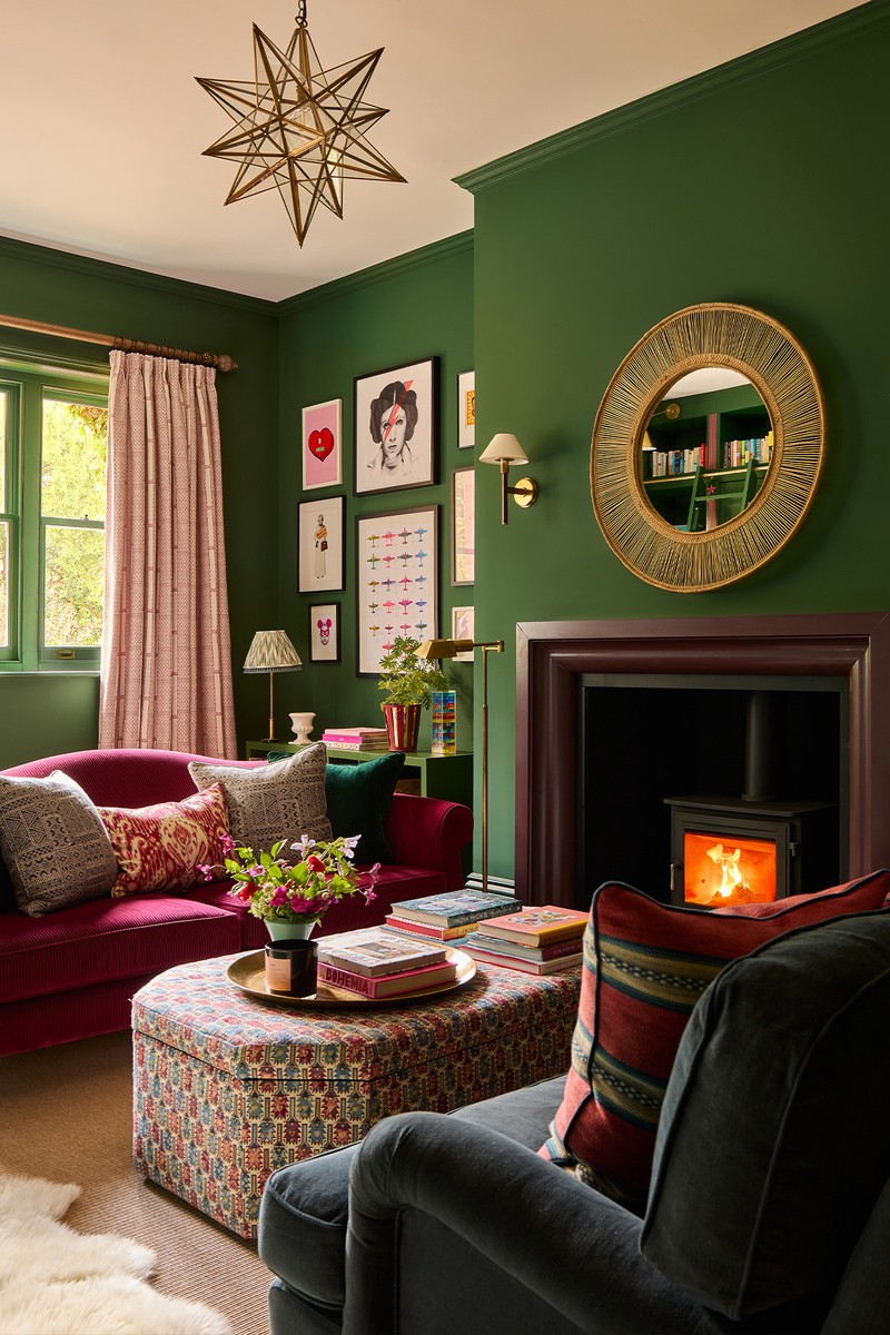 The greens and raspberry tones from the hallway continue here but in deeper, more saturated hues. Jewel-toned fabrics – think emerald velvet, aubergine linens and tapestry-inspired patterns to bring richness. Natural oak joinery adds timeless elegance and antique brass library lights create a warm, atmospheric glow.