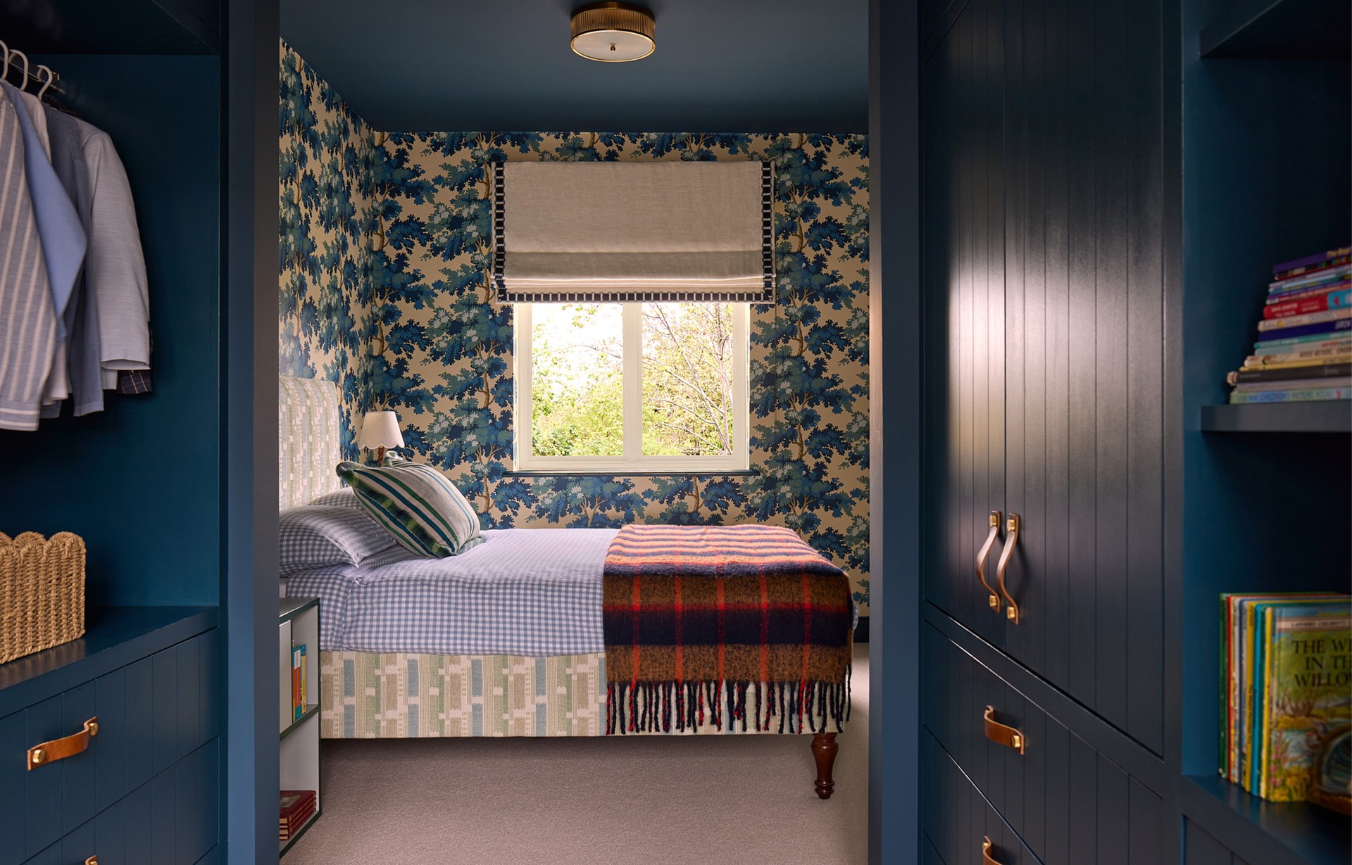 The son was very clear that he wanted a “forest bedroom" so that led us to source a striking tree-scape wallpaper, which immediately set the tone for the scheme. Layered with warm woods and tactile textiles in a beautiful deep jewel blue, the space feels immersive yet comforting – imaginative but still sophisticated enough to grow with him.