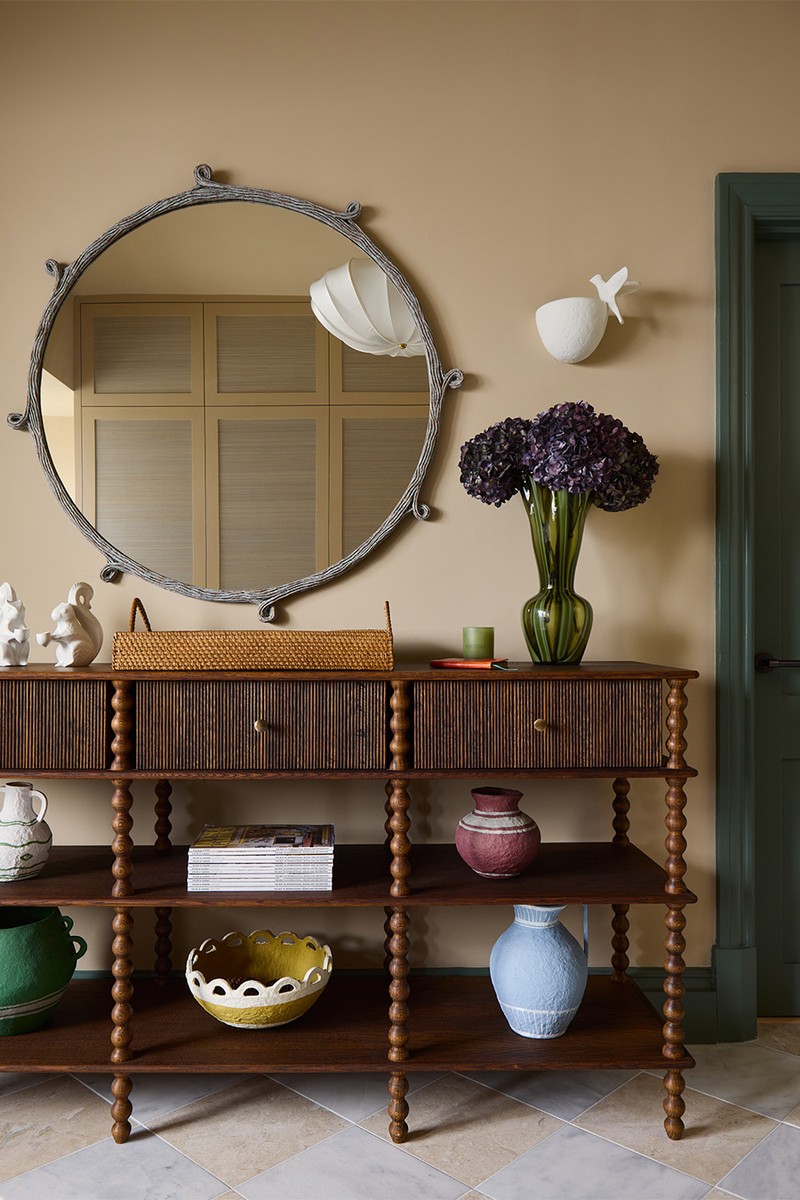Here, we created a calming, earthy backdrop that would flow from the entrance up through the landings. The client was drawn to warm neutrals, so we chose ‘Tawny’ by Edward Bulmer for its creamy, beige warmth. All the walls and ceilings are colour-drenched, with blue-green woodwork (including the staircase, skirting and doors) to create continuity throughout the house. Chequerboard marble flooring in soft beige-pink tones keep the space light and fresh and the bespoke joinery for storage and bench seating is also painted in ‘Tawny’ with inset silk wallpaper panels for texture. Rattan baskets beneath the bench and a tapestry cushion add warmth, while the bespoke dark oak console and a verdigris mirror introduce depth and contrast.