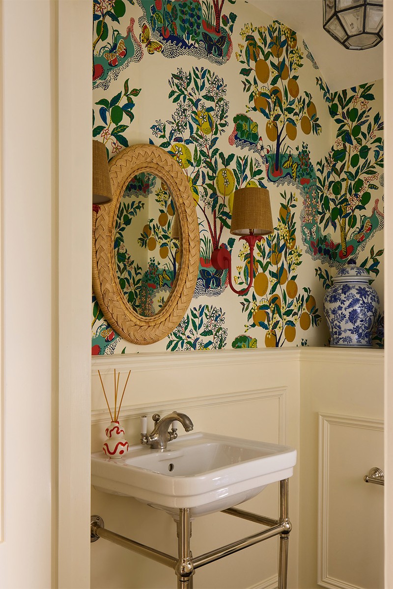 The powder room offered an opportunity for something playful and transportative. Inspired by a Mediterranean garden, the space layers colour and pattern in a way that feels joyful. It’s a small room with big personality – somewhere guests can discover an unexpected burst of colour away from the calmer main living areas.