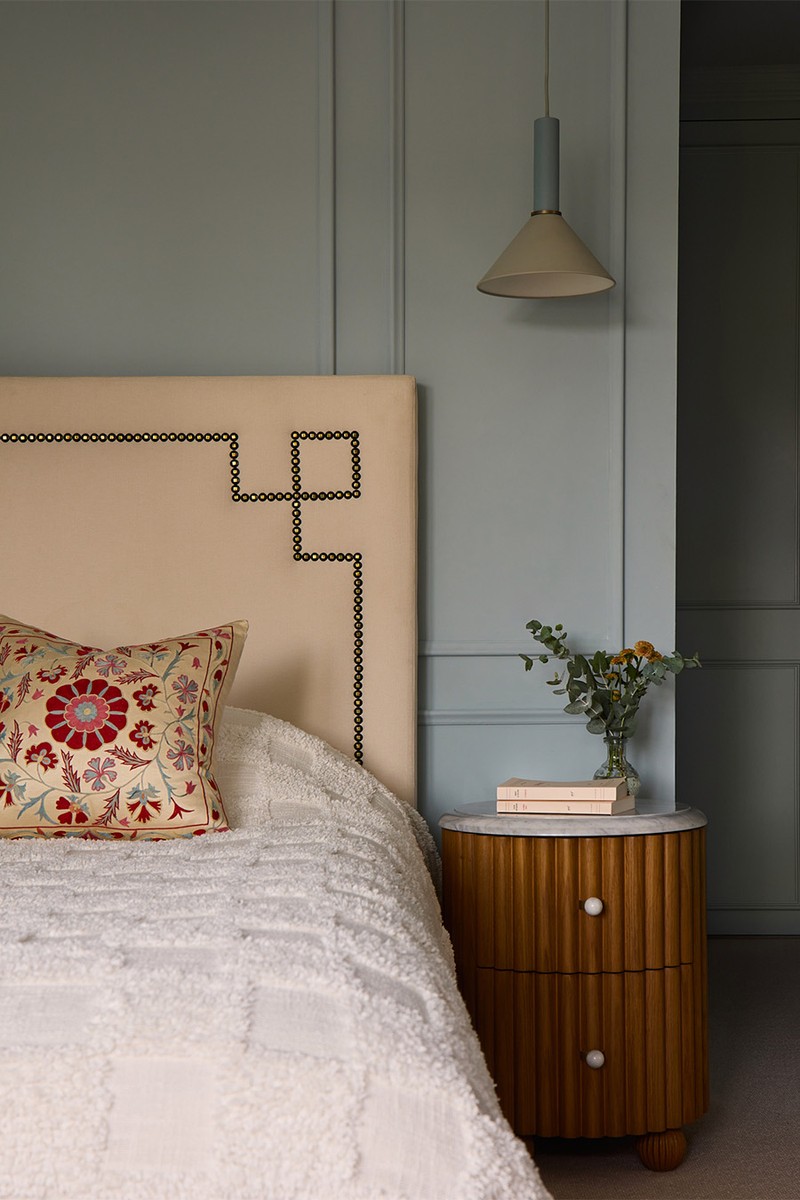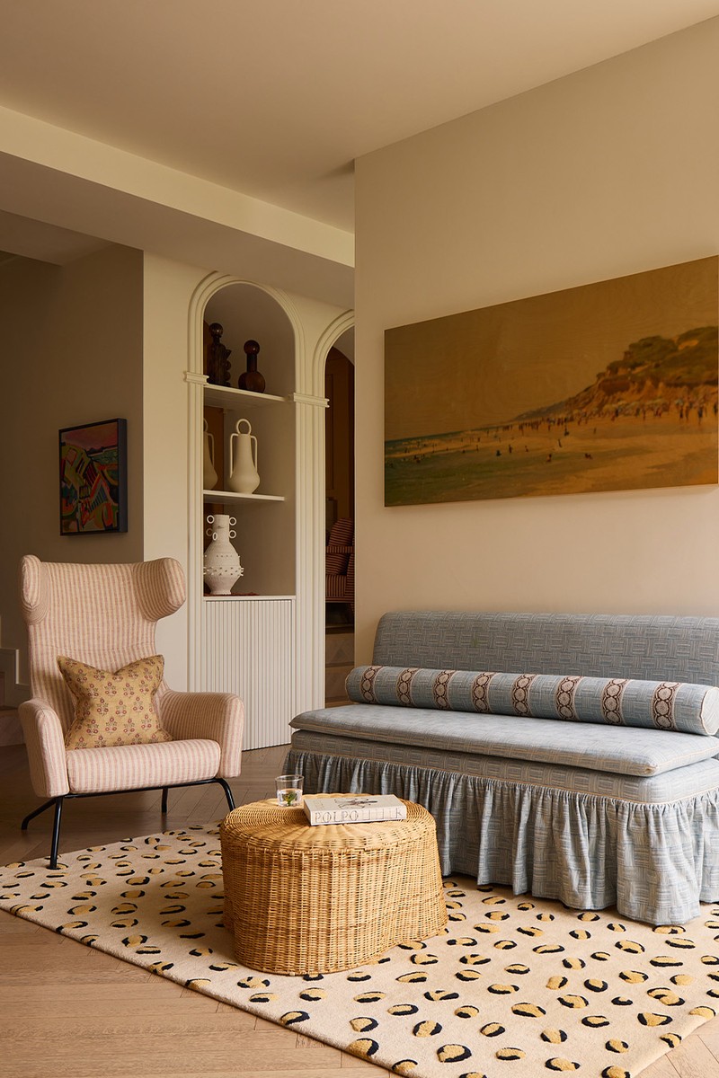 The entrance set the tone with an earthy, creamy neutral that flows up through the landings. From there, the palette evolves: a denim-inspired living room punctuated with primary accents; a cinnamon-drenched sitting room that feels cocooning and sun-kissed; peach and cinnamon tones in the girls’ bedroom; deep blues in the main suite and boy’s bedroom.