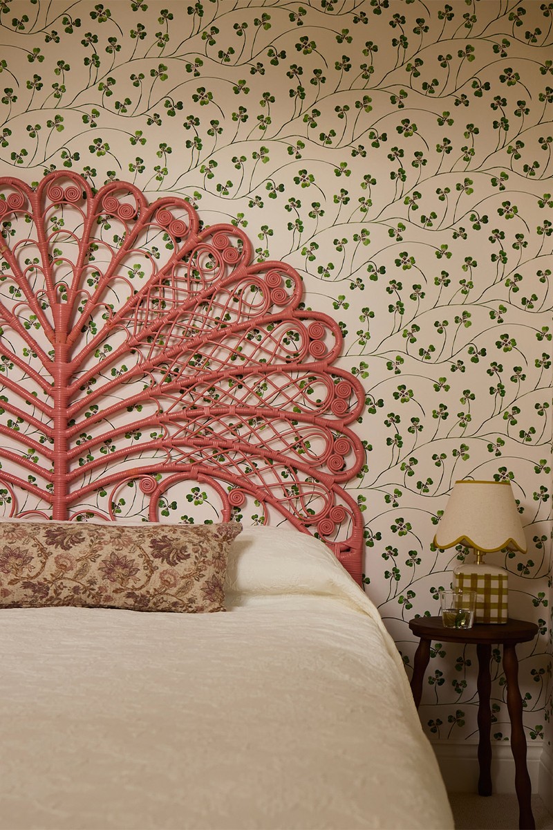 The guest loft bedroom draws inspiration from the English country. With its uneven ceilings and walls, we leaned into the quirks of the space, using a leafy wallpaper to soften angles and disguise irregularities. The result is somewhere fun and slightly unexpected – a charming retreat tucked away at the top of the house.
