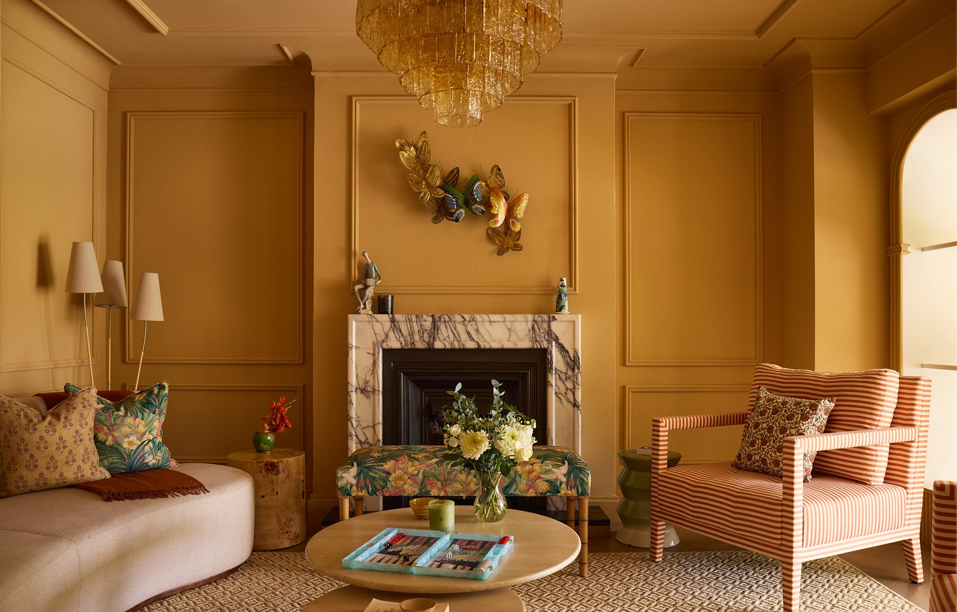 We wanted to create a light-filled room reminiscent of Palm Beach or the Mediterranean, so the entire room was colour-drenched in ‘Cinnamon’ by Edward Bulmer for cocooning warmth. To introduce architectural character, we reinstated wall and ceiling panelling and a new Viola marble fireplace surround, while a glass pendant adds an amber glow. Bespoke arches link visually with the dining room beyond, creating a dramatic stepped transition.