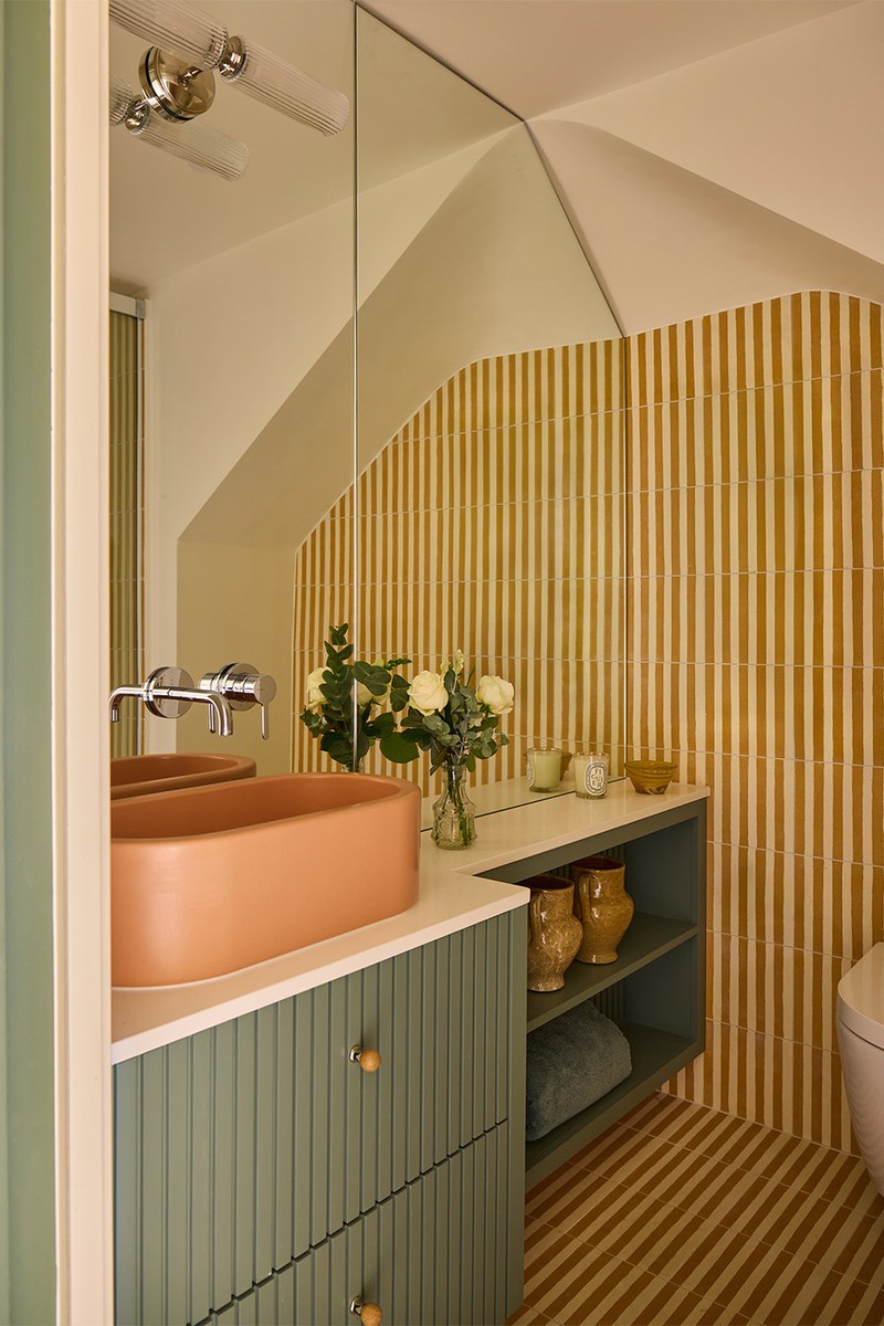 The adjoining loft bathroom presented a challenge as it's very small, awkward and constrained. We reworked the layout to improve flow and functionality, making every centimetre count. Mustard stripe tiles were the starting point for the scheme, injecting warmth and personality into the compact space. It’s bold, playful and entirely unexpected – a small room with a confident impact.