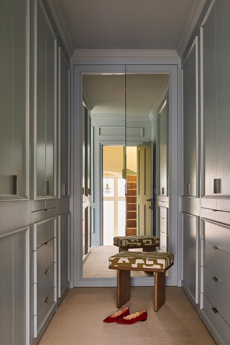 The property felt boxy and stripped of character, particularly as many original features had been removed during earlier extension works. To reintroduce architectural interest, we added wall and ceiling panelling in some rooms, and we colour-drenched the staircase and all the woodwork throughout the house in a blue-green tone (Farrow & Ball’s ‘Green Smoke’), creating continuity and visual rhythm from floor to floor.