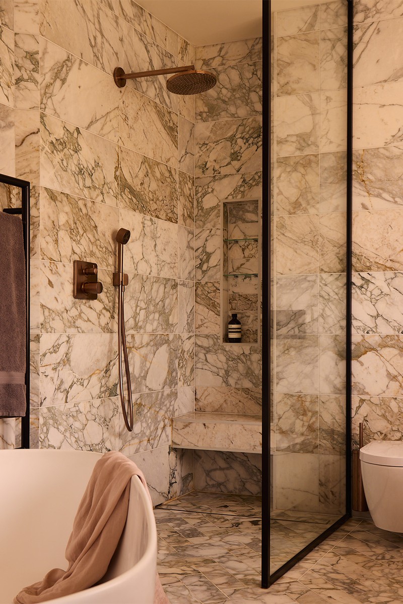The ensuite continues the retreat-like sanctuary brief, inspired by spa environments and natural materials. A large window allowed us to frame the double vanity beautifully, complete with bespoke swivel mirrors that add both practicality and elegance. The generous footprint enabled a wet-room feel, with a spacious walk-in shower and freestanding bath. The overall effect is a place to pause and unwind at the end of the day.
