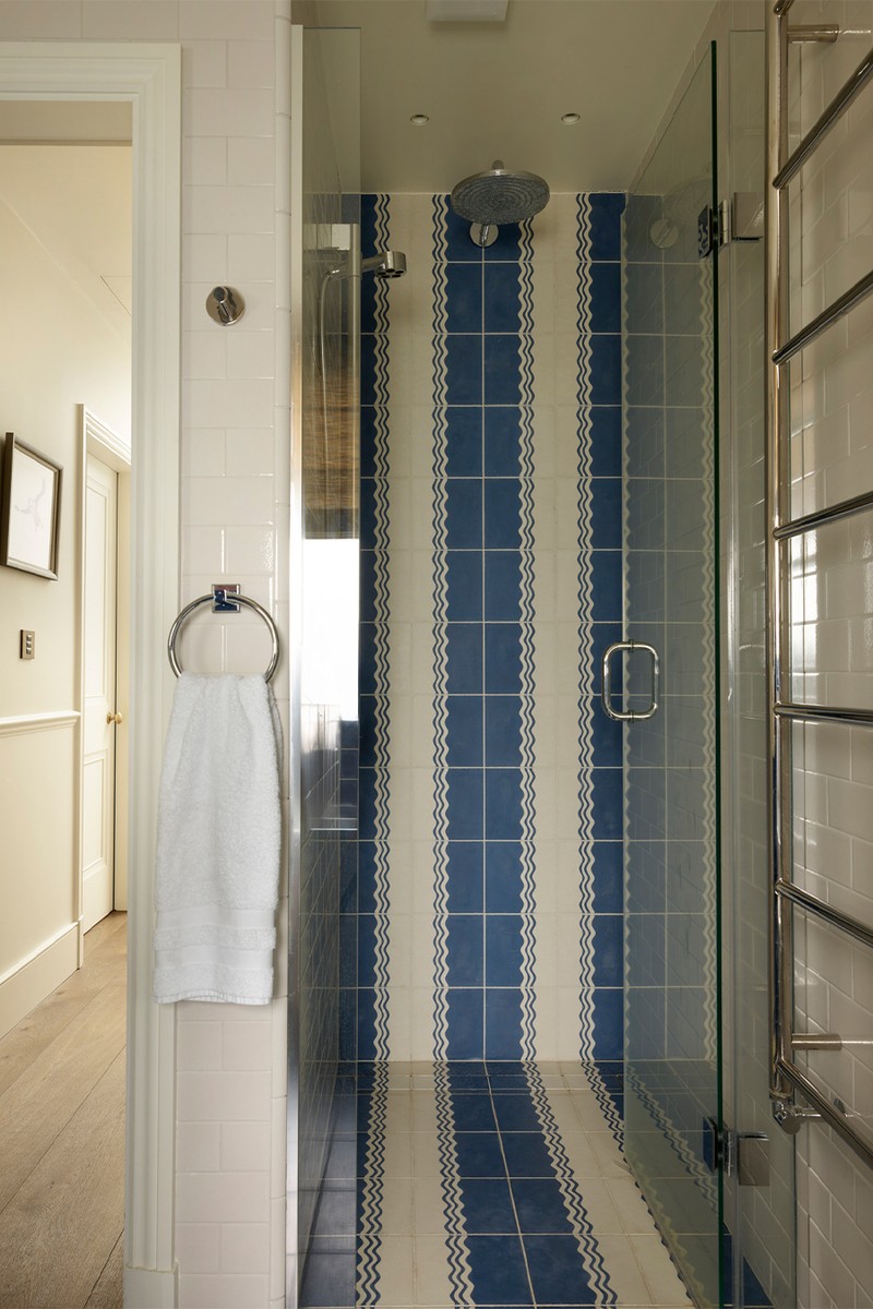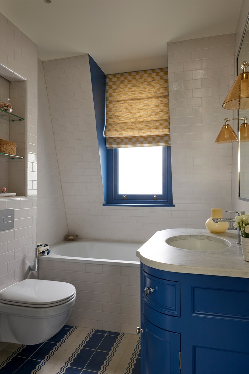 We designed this space around a cheerful blue and yellow palette, combining playful shower tiles with wall lights from Pooky. The blind is a timeless and versatile pattern that adds just the right touch of structure to balance the room.