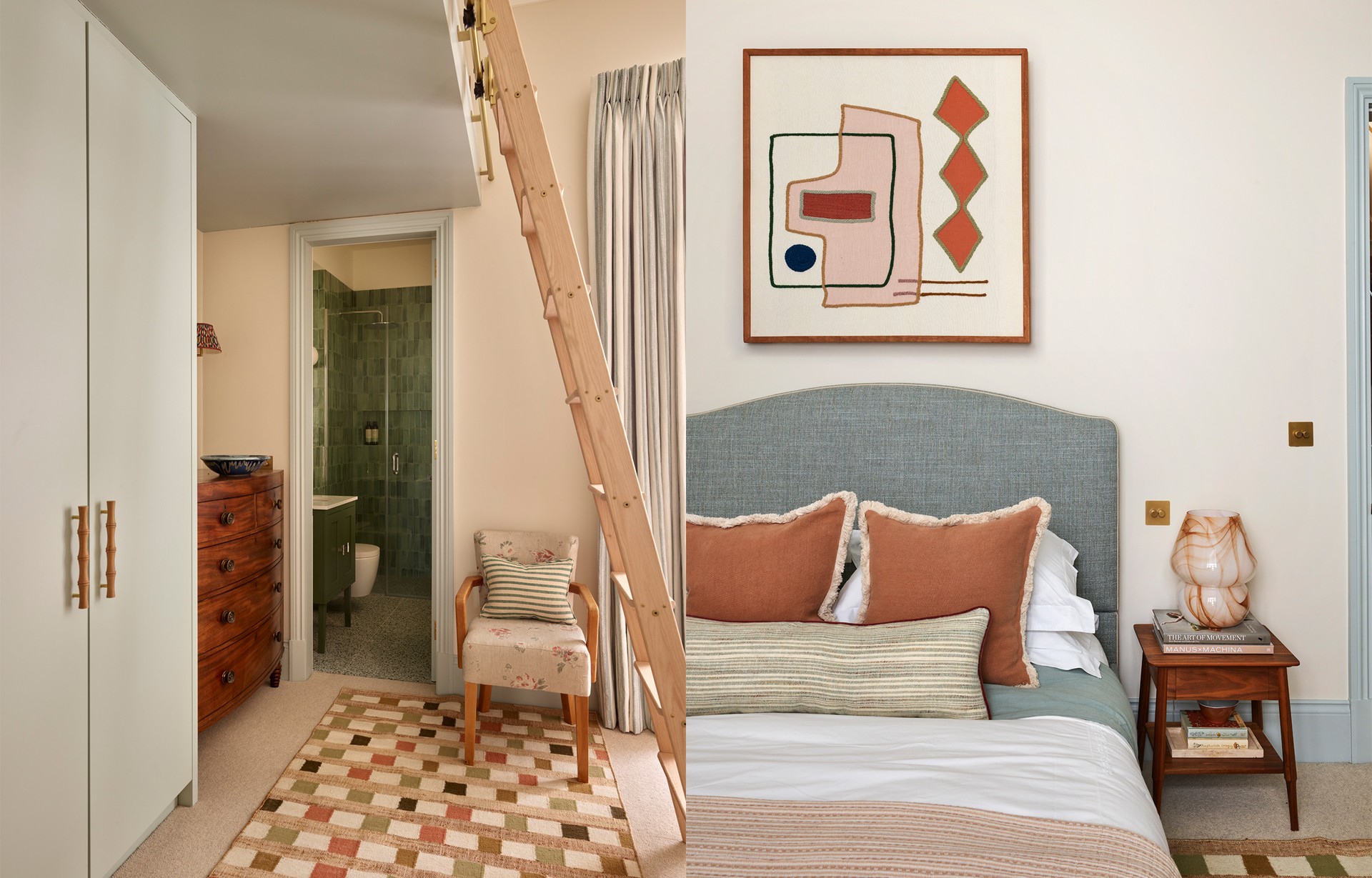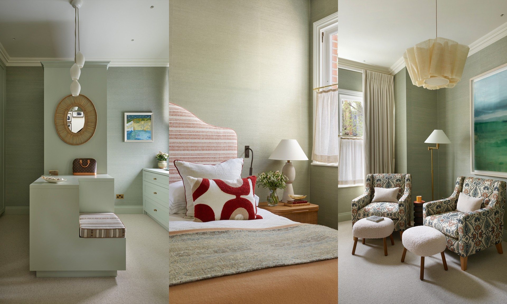 The main bedroom suite features a soothing palette of serene blues and greens, accented with touches of neutrals and burnt orange. We incorporated unique South African finds in the armchairs and artwork, paired with the bedside tables. The bed is upholstered in a favourite fabric from Christopher Farr, adding texture and character to the headboard, while a striking pendant light completes sitting area. The adjoining dressing room continues the colour story, seamlessly flowing into the main bathroom for a cohesive and calming feel throughout the master suite.