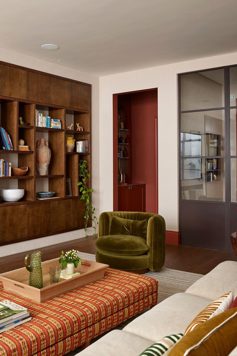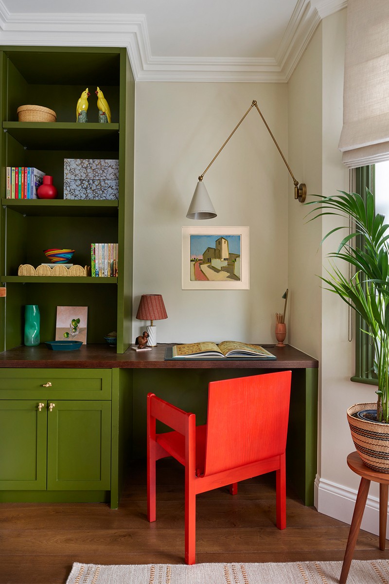 We designed a home office overlooking the garden, featuring bespoke joinery painted in ‘Olive’ by Little Greene. A wall light adds a warm, contemporary touch, making the space feel both practical and inviting.