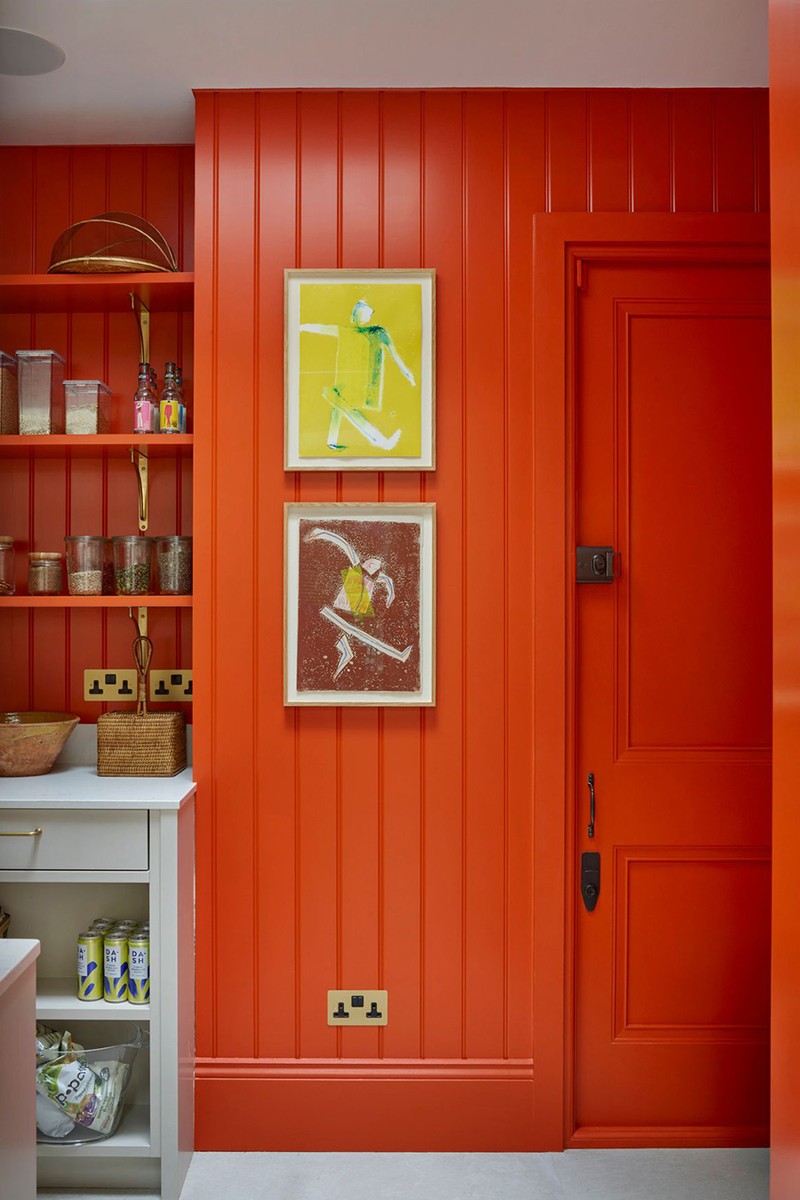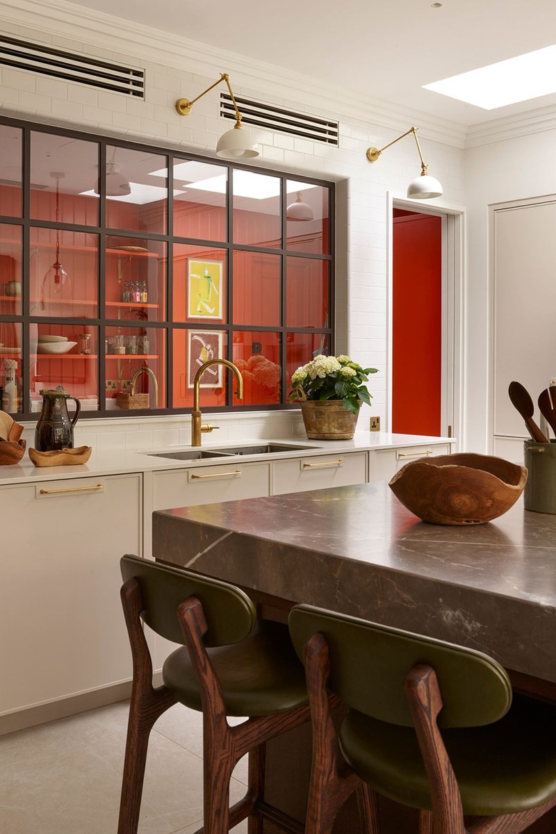 The kitchen was a collaboration between Icon and 202 Design. Our clients, who love to entertain, wanted to include a secondary mess kitchen and larder. This space is separated by a Crittall-style window, allowing us to introduce a bolder colour without overpowering the main kitchen, living and dining areas. For the banquette seating, we chose a durable outdoor fabric from Romo, perfect for withstanding the demands of busy family life while still offering a stylish finish.