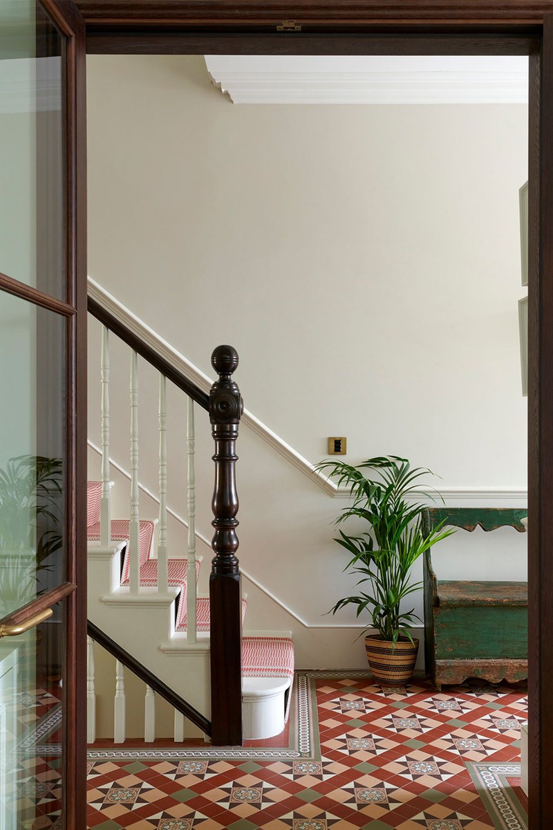 Our aim was to create a welcoming entrance that felt both inviting and sympathetic to the history of the house. We replicated traditional Victorian tiles to reflect the original flooring and maintain architectural continuity. The striking folk bench, sourced from John Cornall Antiques, adds charm and practicality, and doubles up as shoe storage. The artwork we sourced from the Decorative Fair – which remains one of our favourite places to discover unique pieces at accessible prices.