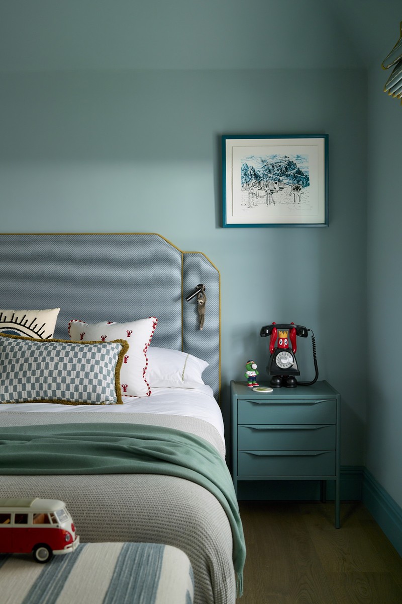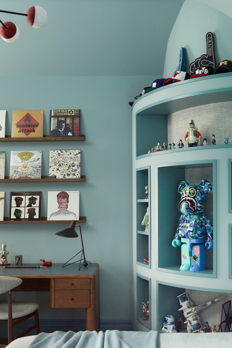 The boys’ room was designed to feel slightly more grown-up. The scheme is simpler and more restrained, built around a combination of blue and citrine green drawn from the rug and the roman blinds. When a new passageway was introduced behind the room, it created an awkward curve in one corner. Rather than treating this as wasted space, the designers turned it into a built-in niche with shelving where he can display figurines and magazines. Artwork is approached in a playful way here: instead of a single large piece, a set of vinyl record shelves allows album covers to act as ever-changing art, evolving as his collection grows. Like his sister, he also has a hidden reading nook above the wardrobe. In this case, the space is lined with wallpaper, so climbing the ladder feels like stepping up into the clouds. From the bedroom below, glimpses of the wallpaper overhead add a subtle and whimsical detail.