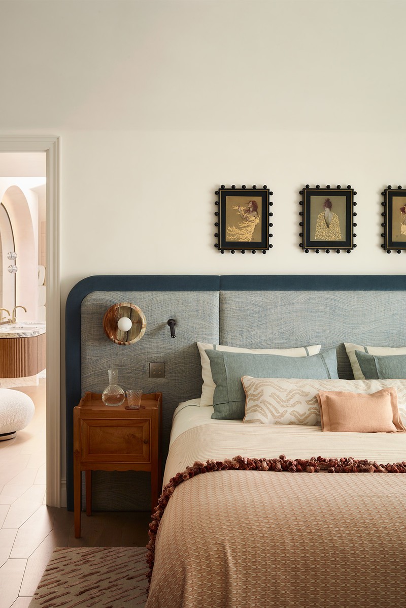 The main bedroom continues the home’s theme of soft curves and cocooning textures. Here, both walls and ceiling are finished in a textured Bauwerk paint, while the ceilings have been subtly curved to echo the shapes introduced elsewhere in the house. A wall-to-wall headboard upholstered in a wave-patterned fabric was chosen to evoke the sea and create a calming atmosphere. Bespoke roman blinds embroidered with ginkgo leaves nod to the craftsmanship of the Arts & Crafts era, while the owners’ artwork is displayed in custom frames designed by the studio. Wall lights featuring peach-toned marble shades echo the bathroom lighting, and the flooring flows seamlessly between the bedroom and the adjoining bathroom to strengthen the connection between the two spaces.