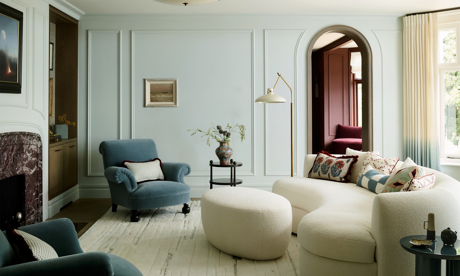 By contrast, the living room feels light and airy. Walls and panelling are painted in a soft sky blue, creating a calm backdrop for the space. An ombré curtain fabric gently frames the bay windows and the views beyond. A sofa and ottoman sit opposite the curved fireplace, while bespoke joinery on either side provides space for books and family photographs. A plush bespoke rug adds softness underfoot, and vintage lighting sourced by the client lends the room an authentic, layered feel.