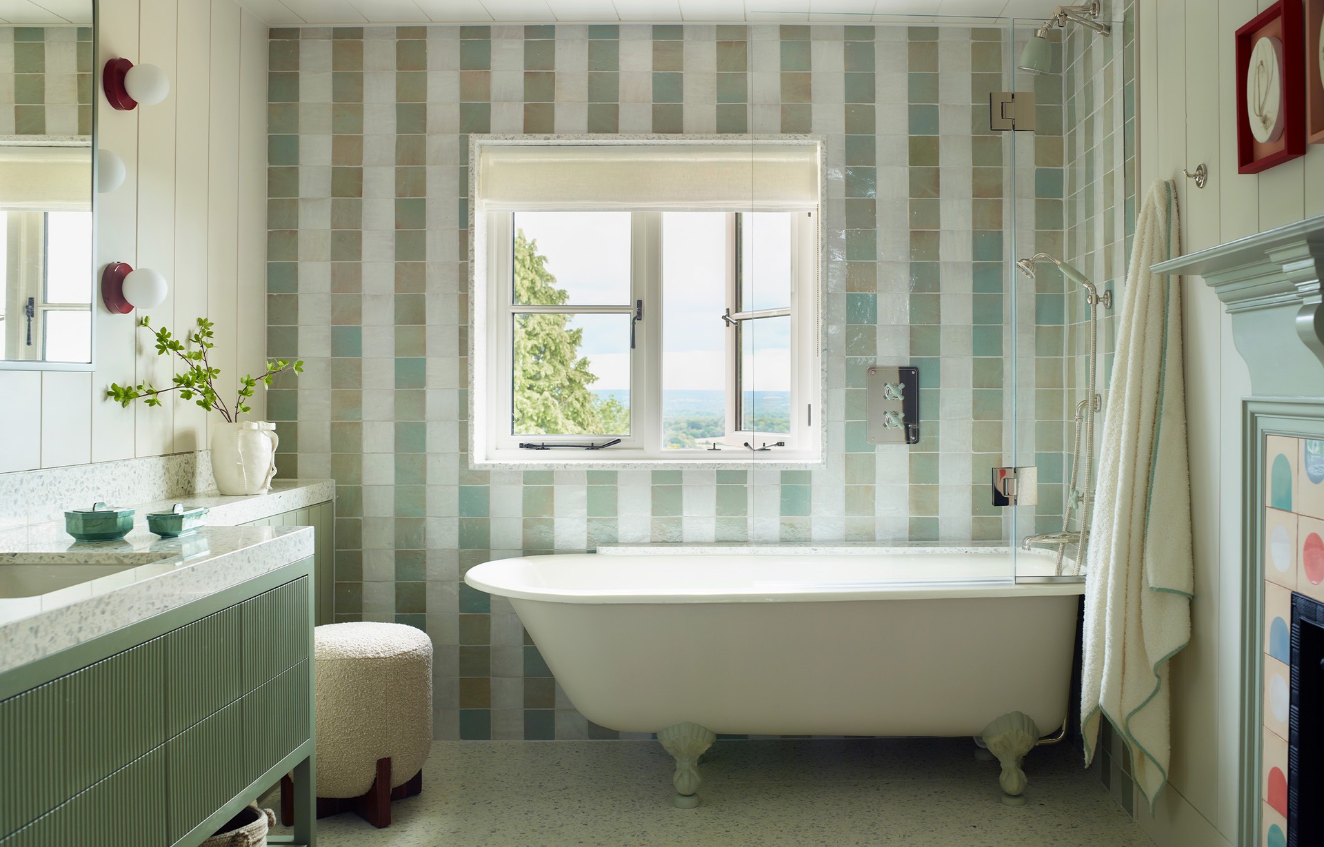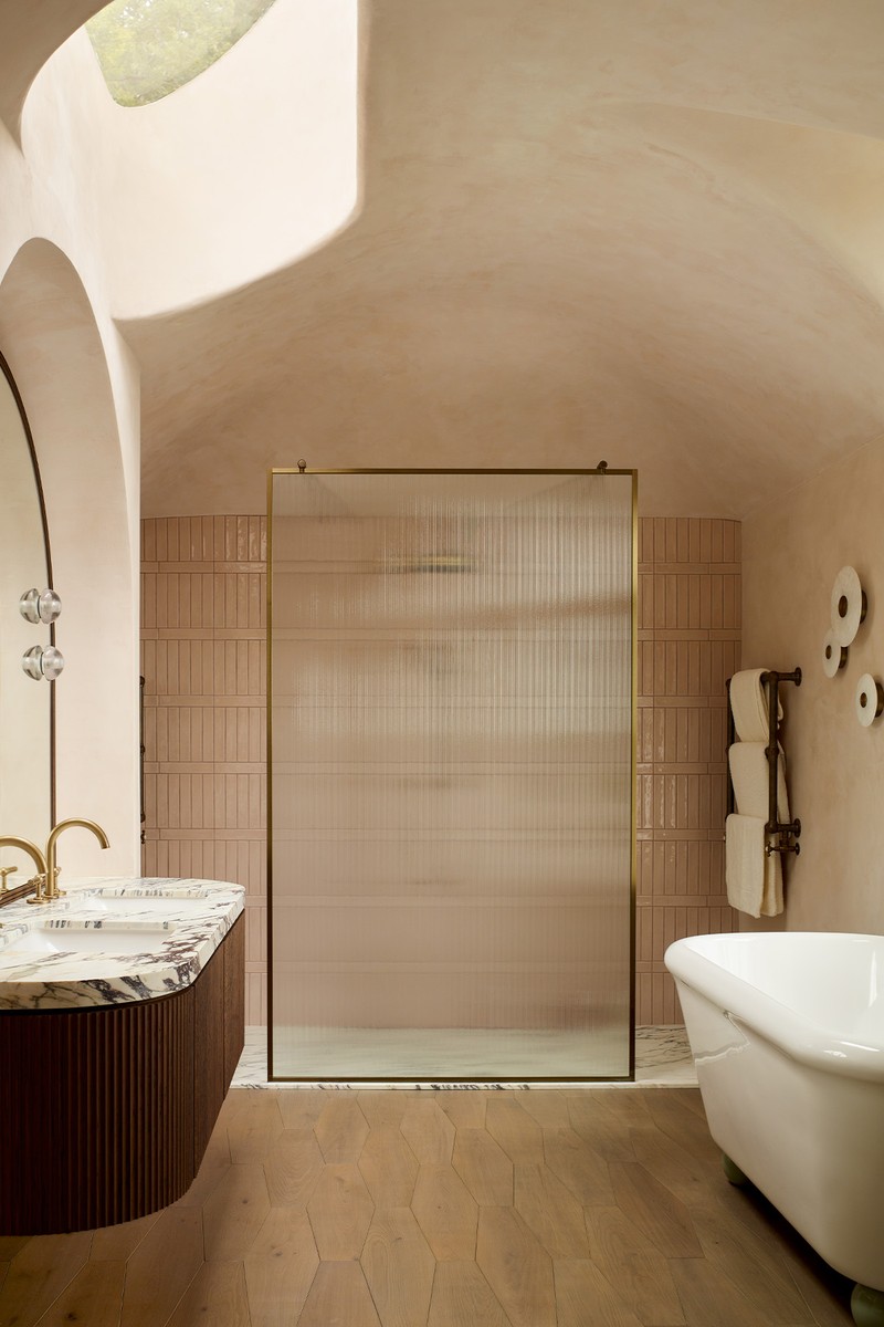 Upstairs, the main bathroom has been transformed into a serene, spa-like retreat. To create a sense of softness and calm, the designers introduced a vaulted, curved ceiling and finished the walls and ceiling in tactile tadelakt plaster, enveloping the room in a warm, textured surface. A cleverly shaped skylight casts natural light directly onto the vanity, while gentle lighting from Bert Frank wall lights enhances the tranquil atmosphere. The bath sits in front of the window to make the most of the views, its green ball feet adding a playful touch. Above the vanity, an arched mirror reflects the greenery outside so the surrounding landscape remains visible from multiple angles. A bespoke shower enclosure with reeded glass forms a generous walk-through shower with entrances on either side.