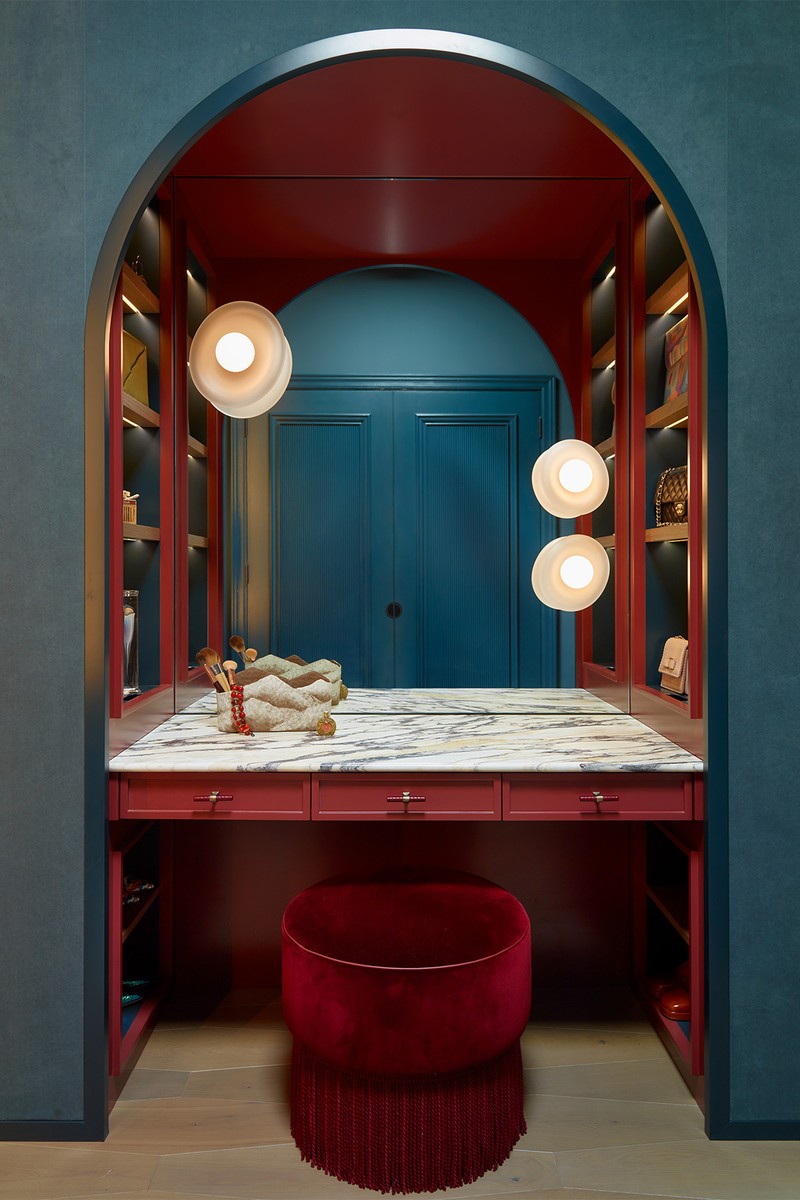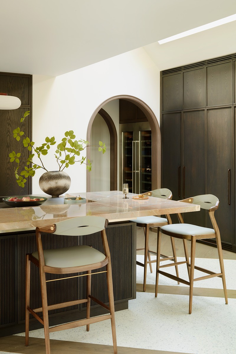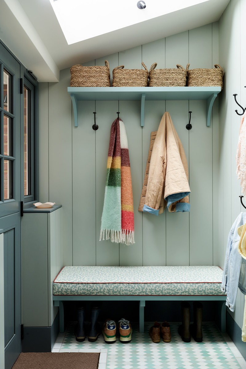 The boot room was designed to be as practical as it is considered. Underfoot, bespoke Zellige tiles were created using a custom colour blend selected to complement the room’s palette. The client was particularly keen to incorporate a trio of blues from Farrow & Ball, which informed the wider scheme. Storage was a key priority here, so the joinery includes pull-out drawers for shoes, tall cupboards for sports kits and high-level cabinets for hats and scarves. Everything can be closed away neatly, allowing the space to remain tidy and organised despite the demands of busy family life. During the project, the family also welcomed a puppy, which led to the addition of a small arched cubby built into the joinery – perfectly sized for a dog bed and echoing the soft arch motif used throughout the house. A bench seat just inside the door offers a convenient spot to sit while putting on or removing boots, while two additional bench seats are integrated into the main joinery, complete with arched back cushions upholstered in a fresh pattern. Even the door itself has been carefully considered: from the outside, it appears as a concealed jib door, allowing the boot room to sit discreetly within the wider scheme of the house.
