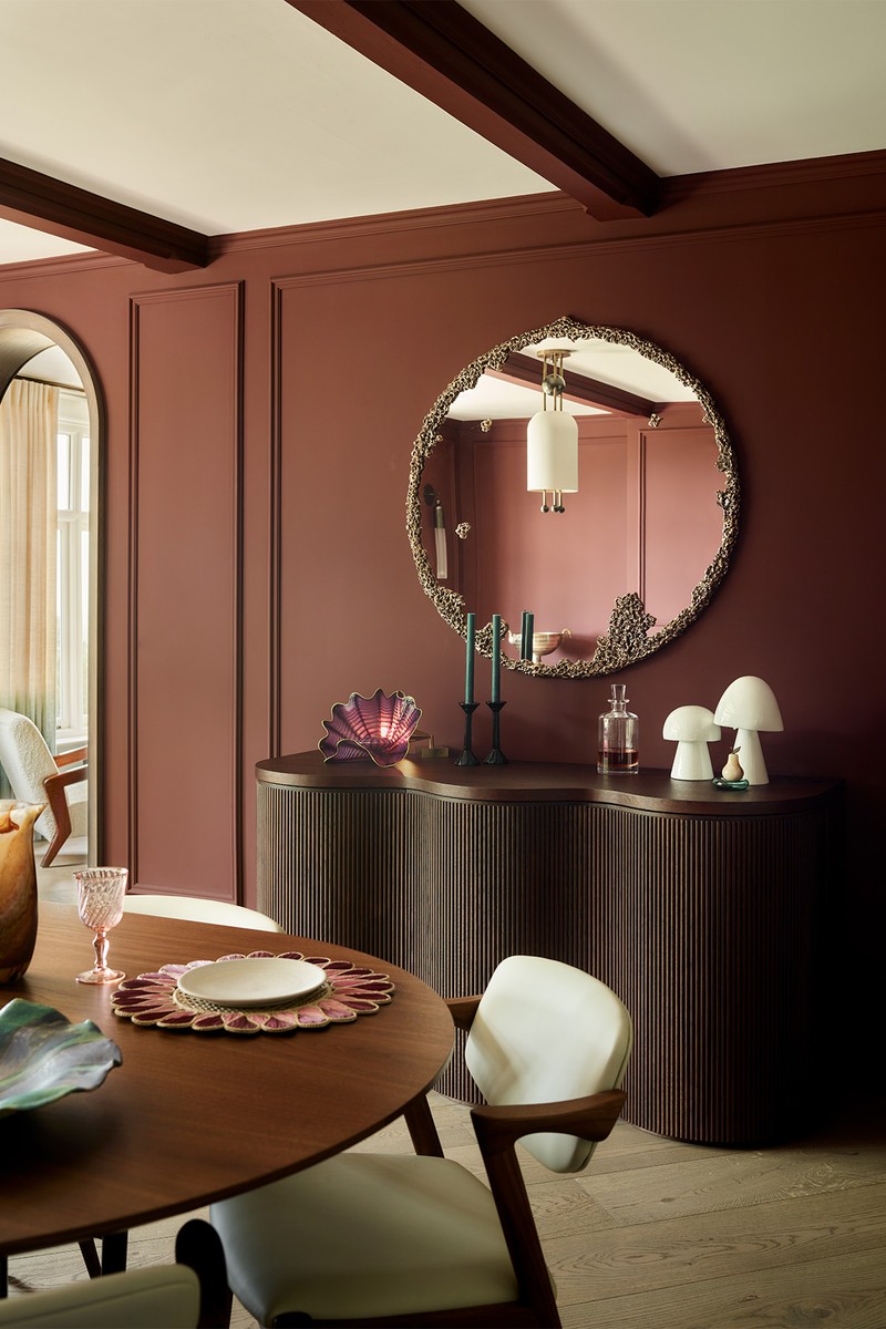 The dining room takes its cue from a striking piece of artwork by Chris Levine featuring Grace Jones, which inspired the room’s rich colour palette of burgundy, purple and teal. Existing beams with delicate chamfered details have been highlighted by painting them the same colour as the walls, while new panelling adds depth and texture. A bespoke stone fireplace crafted from Rosso Levanto marble anchors the space – the same material used in the living room to create continuity between the two areas. Diagonal flooring from the hallway continues here, reinforcing the sense of flow across the ground floor. A velvet-clad window seat within the bay provides a comfortable perch, while the overall mood is intentionally dramatic and intimate, ideal for hosting dinner parties.