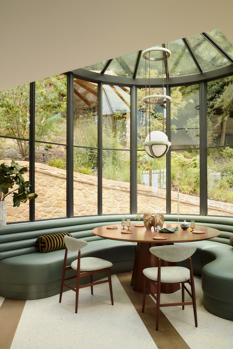 The kitchen extension forms the heart of the home. Designed as a large, open space for family life, it combines practicality with sculptural design details. The client, an enthusiastic cook, wanted surfaces that could withstand professional-level use, so stainless-steel worktops were chosen for their durability and finish. At the far end, the new glazed observatory offers panoramic views of the garden. A bespoke circular banquette fits perfectly within the space, allowing the family to enjoy meals surrounded by greenery and above, a pendant creates a striking focal point. Diagonal timber flooring flows from the hallway into the kitchen, before being broken up with terrazzo slabs to subtly emphasise the scale of the room. The arched glazed window at the back of the house, visible from the front entrance, is echoed by arched thresholds along the hallway, creating a sense of rhythm as you move through the space.