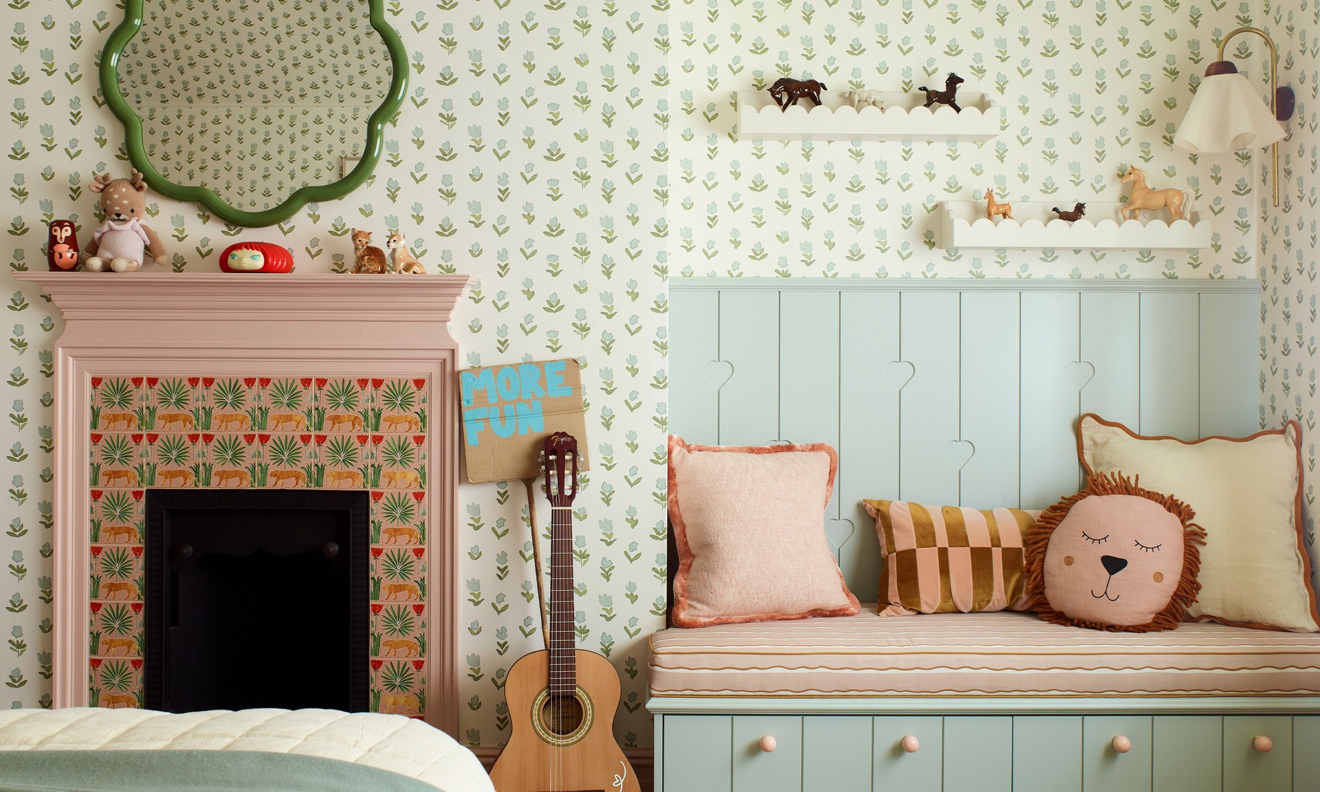 Upstairs, the children’s bedrooms were also carefully reimagined. In the girl’s room, the ceiling was originally low and flat, but raising it significantly transformed the sense of space and light. During construction, the designers discovered unused attic voids above both children’s bedrooms. Rather than leaving these empty, they were turned into secret reading nooks accessed via ladders concealed within the wardrobes. Inside the girl’s nook, bean bags, joinery and reading lights create a private little hideaway where she can retreat with a book. The main room features a delicate floral wallpaper, while the original fireplace, a feature from the house’s earlier history, has been revived with colourful inset tiles to give it a more contemporary feel. Beneath the window, an integrated bench seat forms another cosy reading spot, complete with a small wall light and storage beneath the seat. Much of the furniture here was custom designed, including the upholstered headboards, while the client’s existing dressing table was reupholstered so it could remain part of the room.
