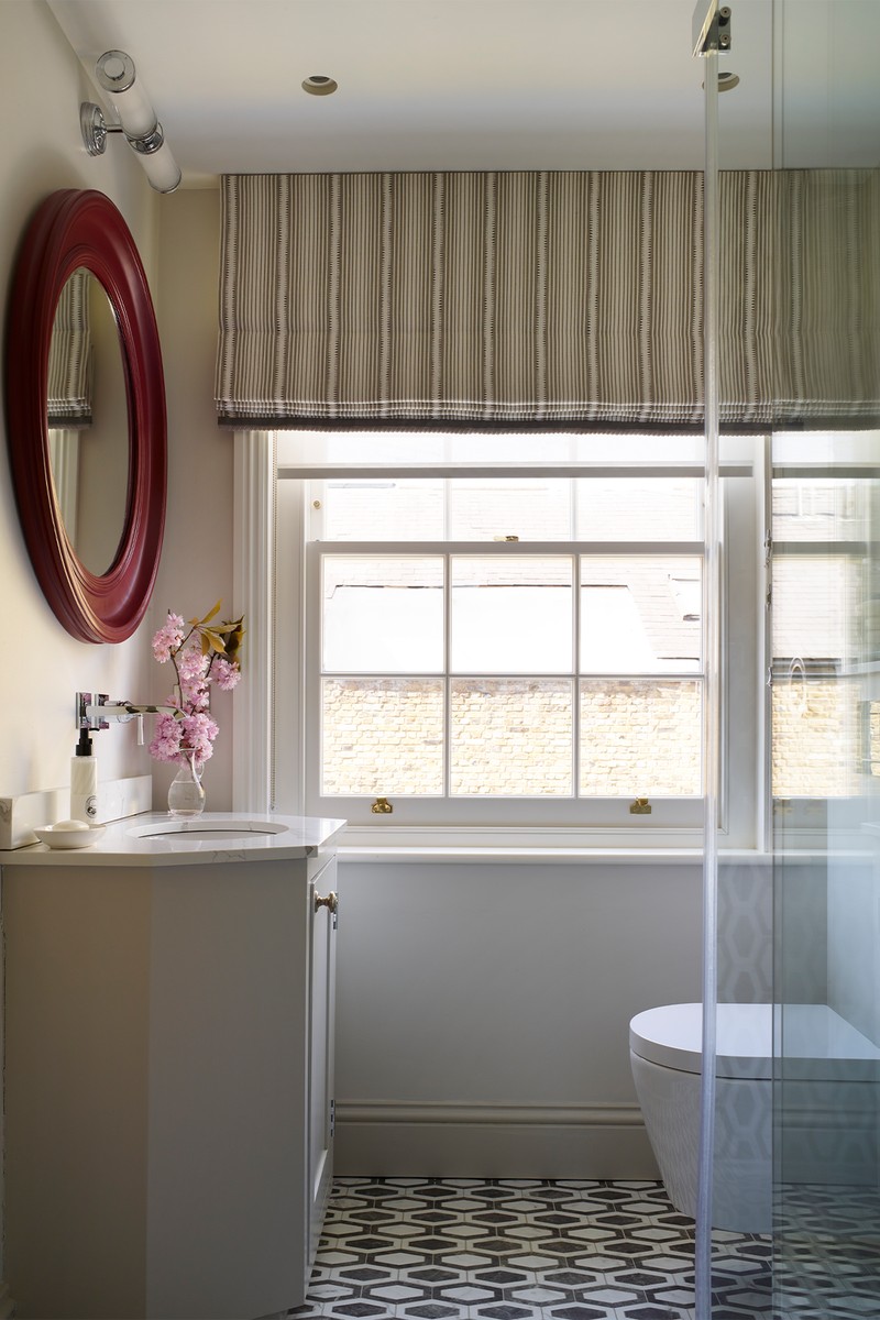 On the top floor, a bright and feminine pastel scheme in the main bedroom was built around a fabric which was chosen long before the renovation started. We matched the pink colour of the walls to the background of the fabric, and a new custom headboard and bedside lampshades in the same fabric added to this cohesive and thoughtfully designed bedroom. The bespoke bathroom vanity unit was designed by us and topped with marble. The plates are antique and belonged to the client, which we decided to put around the mirror to make it more decorative.