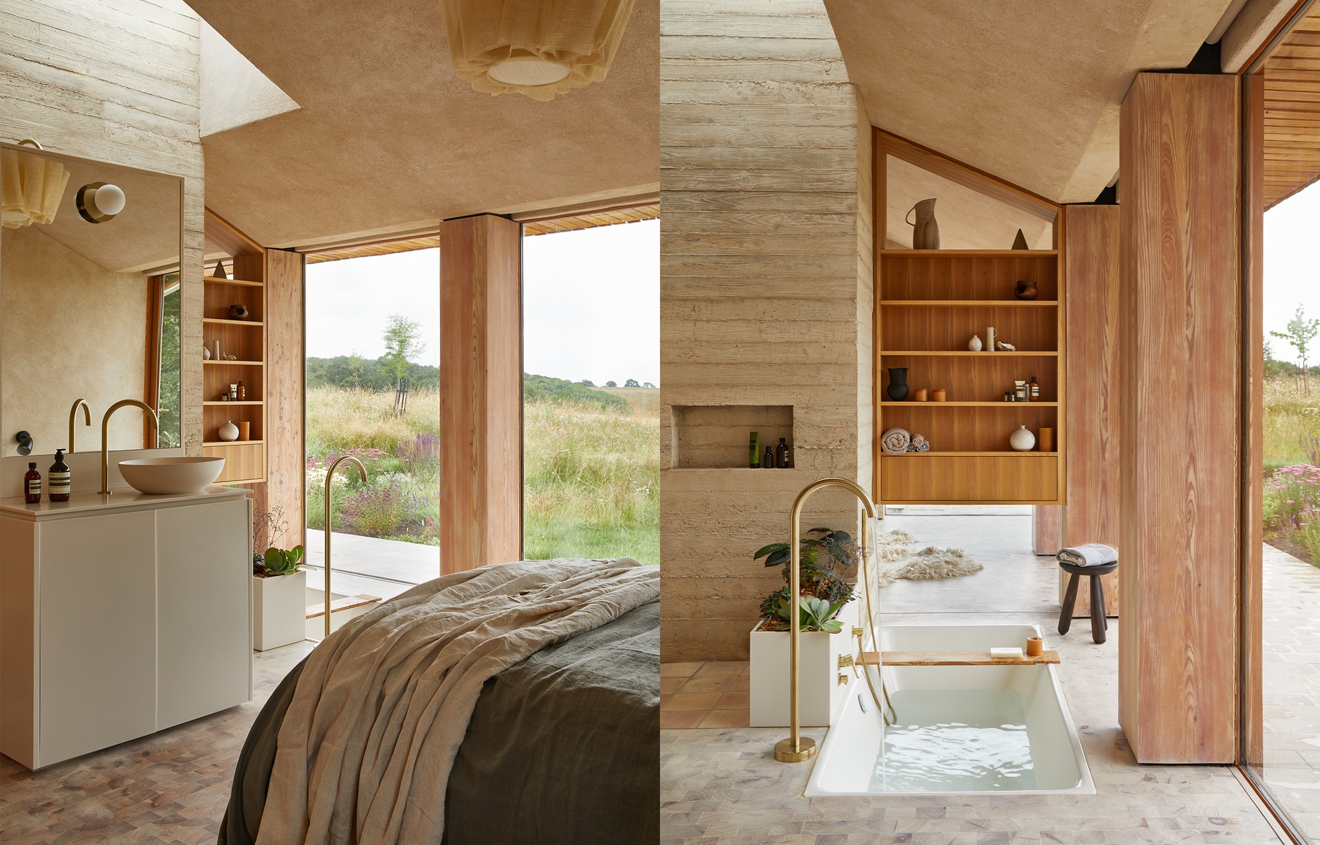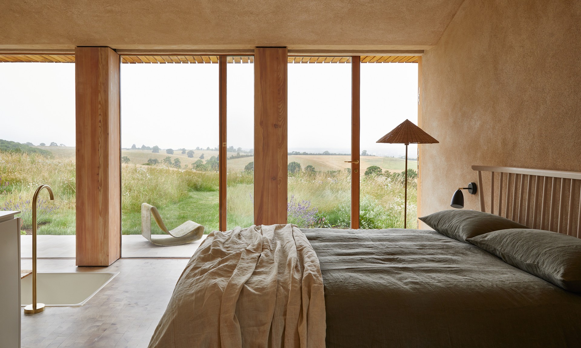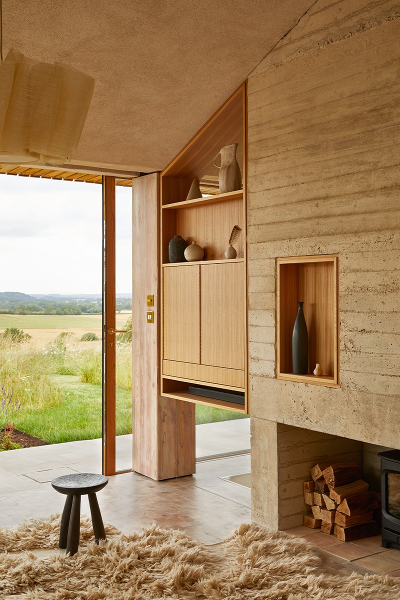 Clayworks natural plaster on walls and ceilings gives an earthen, natural quality, adding comfort and blending the interior spaces with its beautiful natural surroundings. Custom elm joinery conceals a TV and end-grain flooring unifies the spaces; each piece of end-grain was laid individually, mimicking the historic timber cobbled streets in the area.