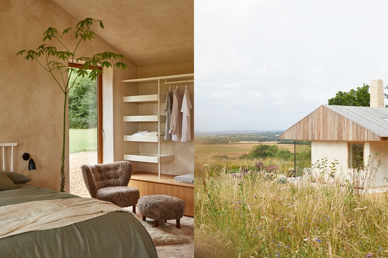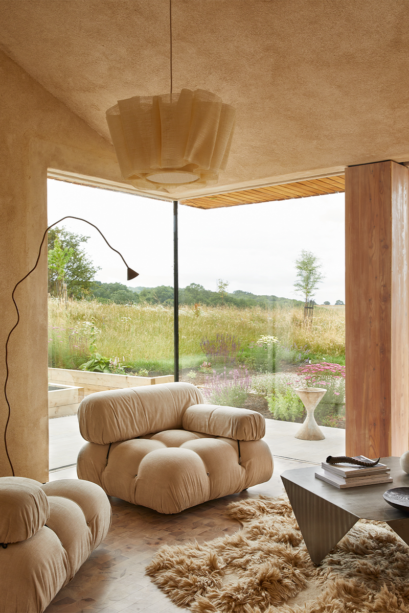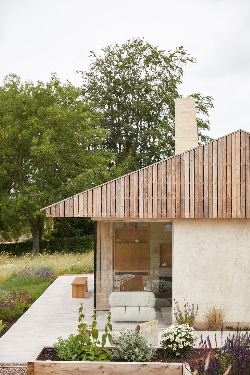 The tones and shades are reflective of the English country. The older the barn gets, the more it belongs with its surroundings (for example, larch timber roof weathers grey). Designed to be timeless with organic, earthy raw tones borrowed from the landscape, we placed an emphasis on crafted, sustainable and natural materials including clay-plastered walls and ceilings, end grain parquet flooring and English elm joinery.
