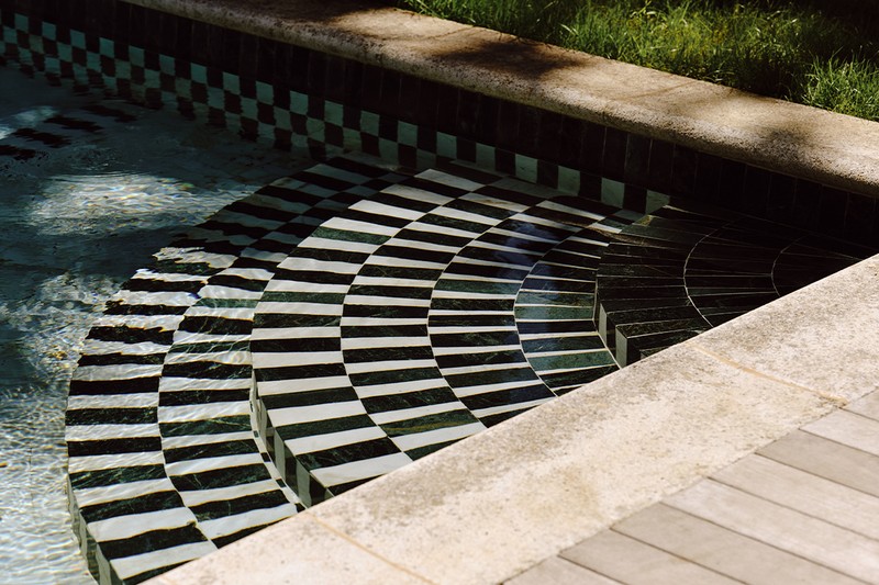 The open-plan ground floor floats from inside to the outside with large sliding doors that lead from the dining room onto the terrace. The various seating areas are covered with a simple cast iron and natural cane pergola. Honed marble in Bert & May’s rose pink, green and white tones add sophistication and texture to the pool areas, including the steps and border.