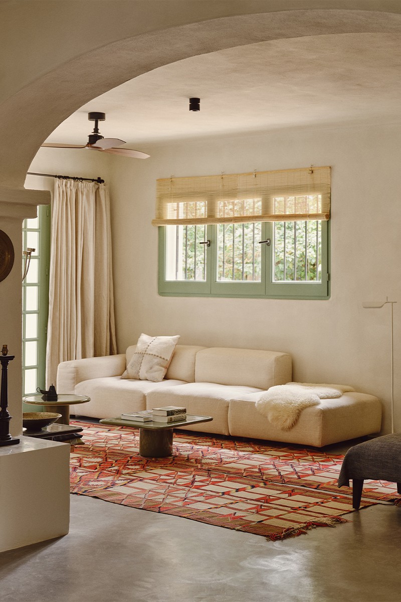 I opted for three smaller coffee tables that keep the room flexible and floating - we chose green and black in three different sizes and shapes. The black table picks up on the tiles and the green picks up on the windows and door frames. A vintage armchair covered in a cotton velvet sits in front of the fire, and a modern cream sofa, simple linen curtains and a daybed rounds off the room. Art by Kate Gibb, a London-based silkscreen artist, hangs in the living room. Her palm series are amazing and perfect for this house.