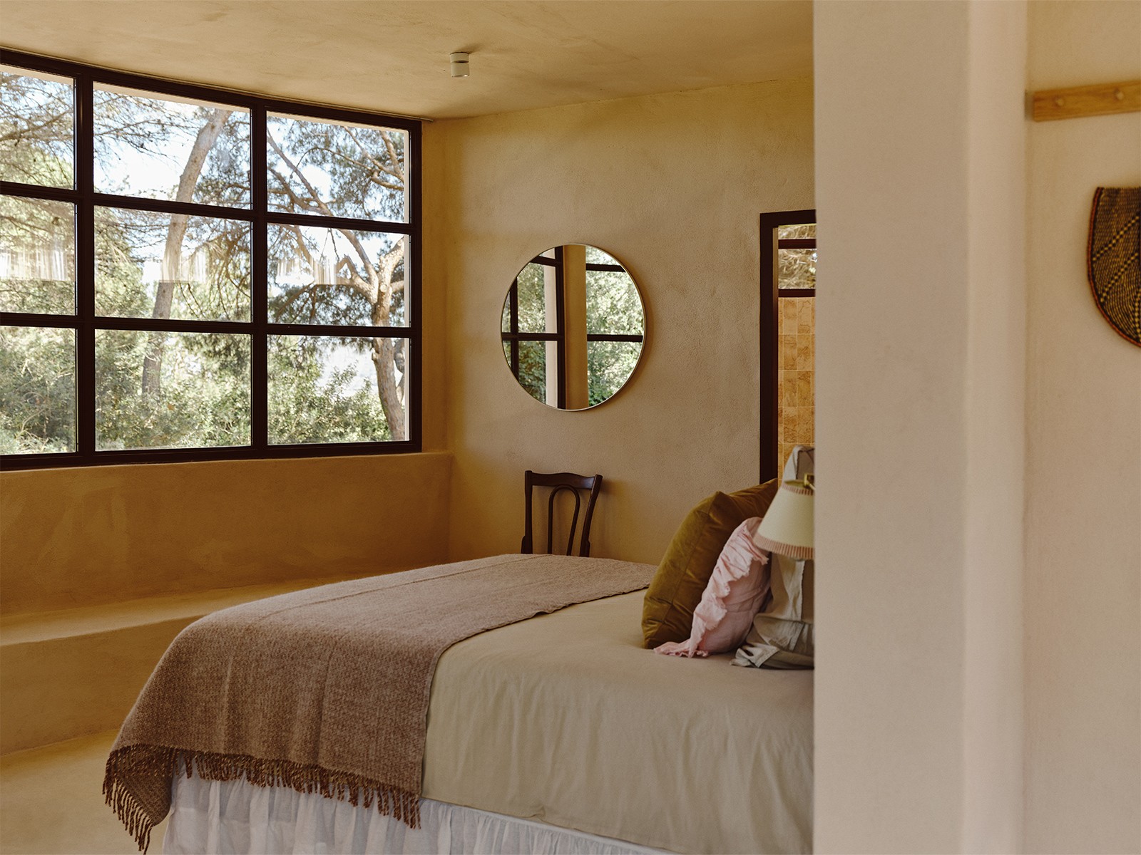 The house was remodelled to create two equal main bedrooms for us both on the upper floor, with a very large, shared terrace covered in a bespoke blue and cream Alalpardo Bert & May cement tile and outdoor shower. An additional room for our mother is on the ground floor. There are two outhouses for guests – one is a mid-century oval pavilion in a striking Mexican pink.