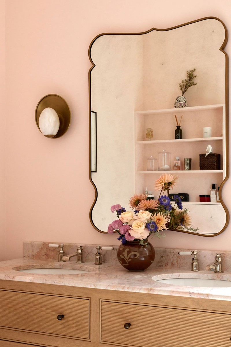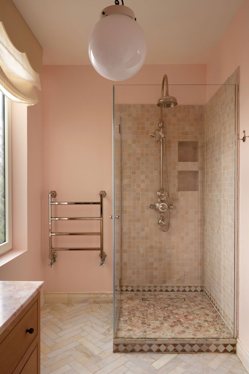 Bathrooms are one of my favourite spaces to design and we had a lot of fun in this one. We wished to conjure a sensual, romantic mood. Continuing the subtle Aphrodite influence from the adjoining bedroom, we chose rose marble, alabaster wall scones and a custom scallop window pelmet. Above, an opal glass pedant hangs like a suspended pearl drop, bringing a soft, luminous glow to the room at night.