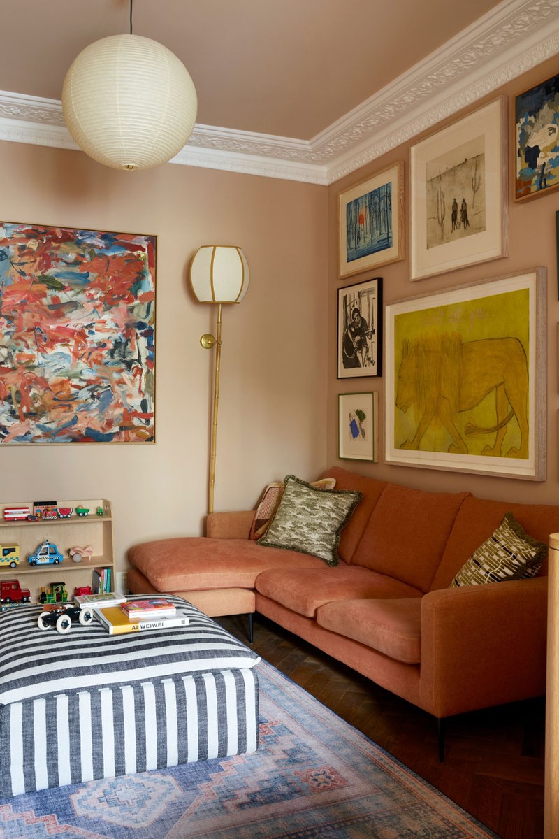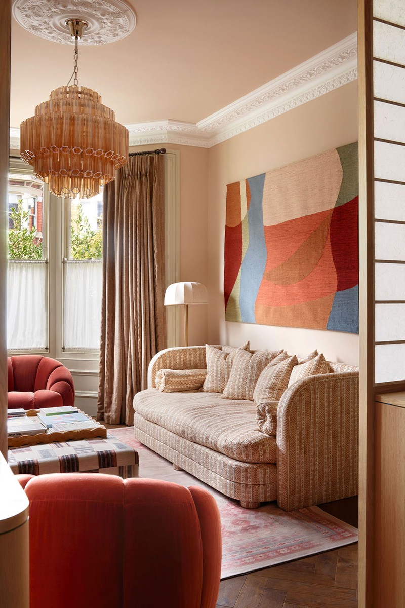 We reupholstered the clients’ existing sofa in a deep, tonal ochre linen, pairing it with a tribal-patterned rug and a striped ottoman to create a playful, expressive mix of pattern and colour.