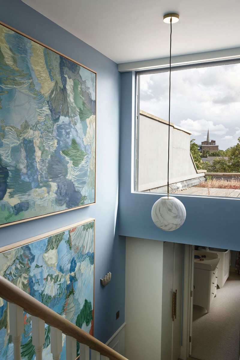 The staircase is something of a deliberate anomaly. While many of the surrounding rooms are wrapped in soft neutrals and warm sandy tones, we wanted the hallway and stairwell to feel distinct, almost a visual breath of fresh air. The contrast brings a subtle drama to the transition between floors. The effect is most striking on the top-floor landing, where two stunning canvases by Anne Griffiths mirror the view of London’s skyline beyond the picture window to create a sense of expansion.