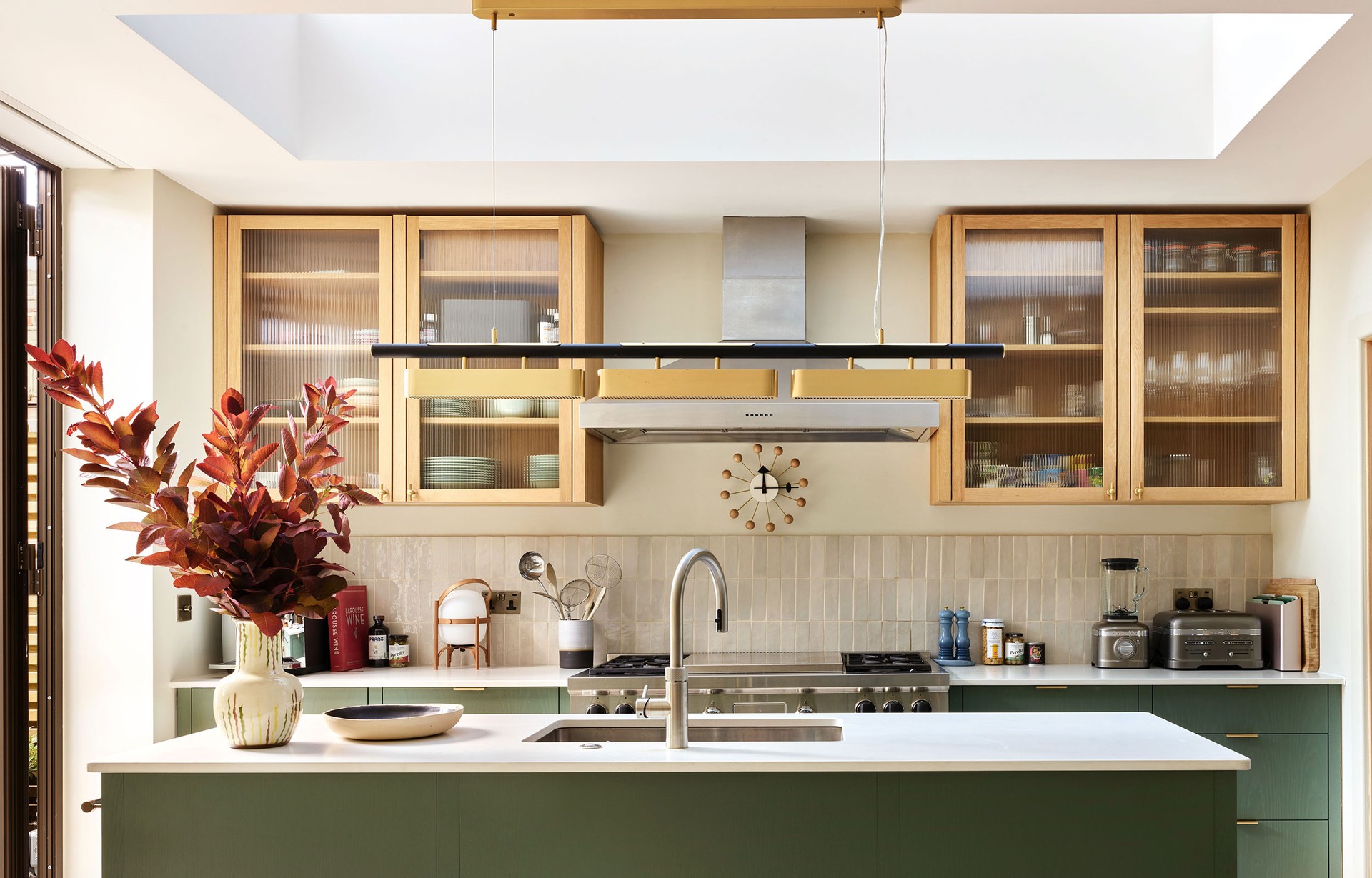 To deepen the connection to the garden and bring a sense of openness, we replaced the previous fixed floor-to-ceiling panes with ultra-slim sliding doors. This single move transformed the energy of the space, allowing the boundary between inside and out to soften. The garden also informed the palette. We chose a verdant green for the base units, pairing them with natural wood grain and warm brass accents that add patina and tactility.