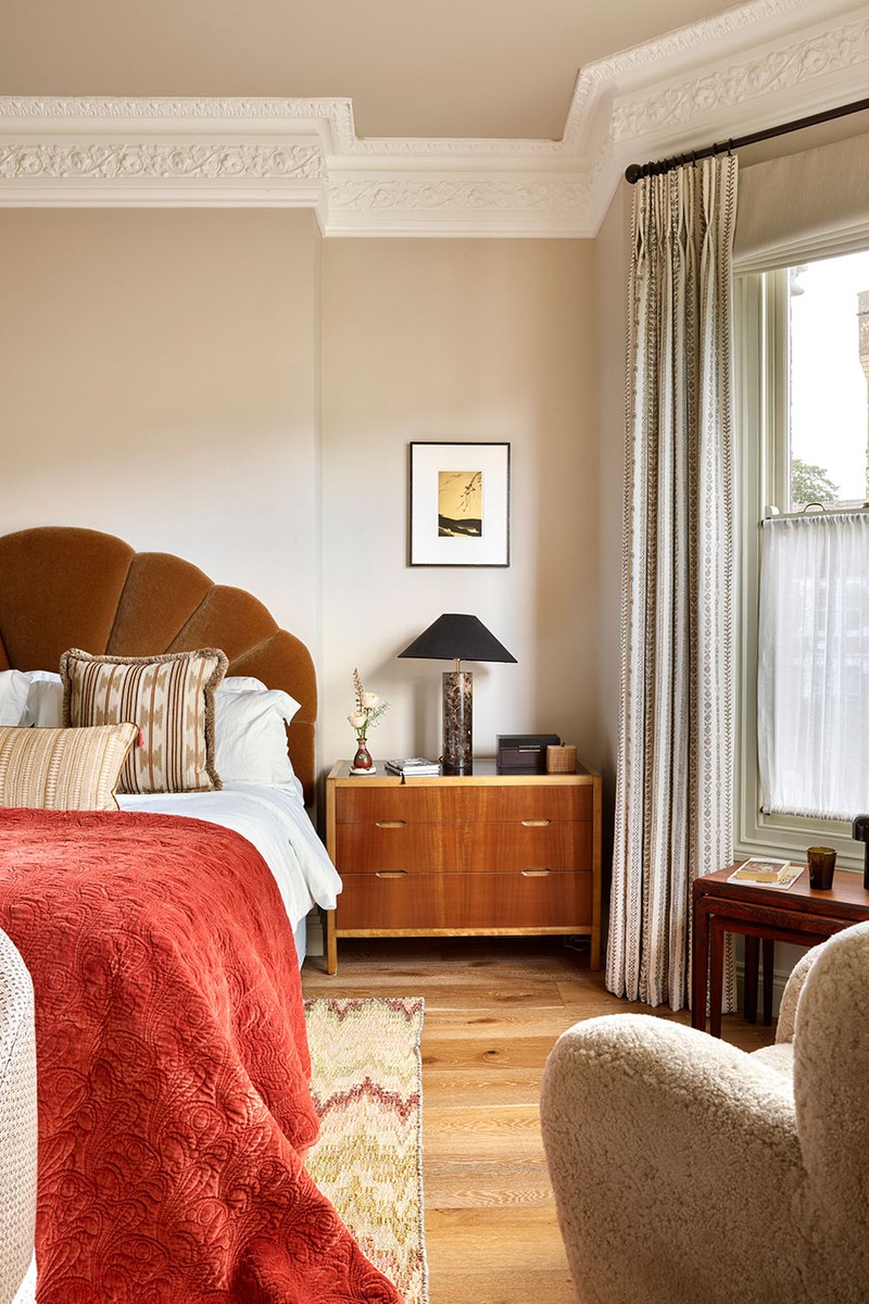 In the main bedroom we set out to create a grown-up escape. Somewhere to unwind with tactile materials, one-off pieces and a dash of flair in the bespoke details and vintage gems.