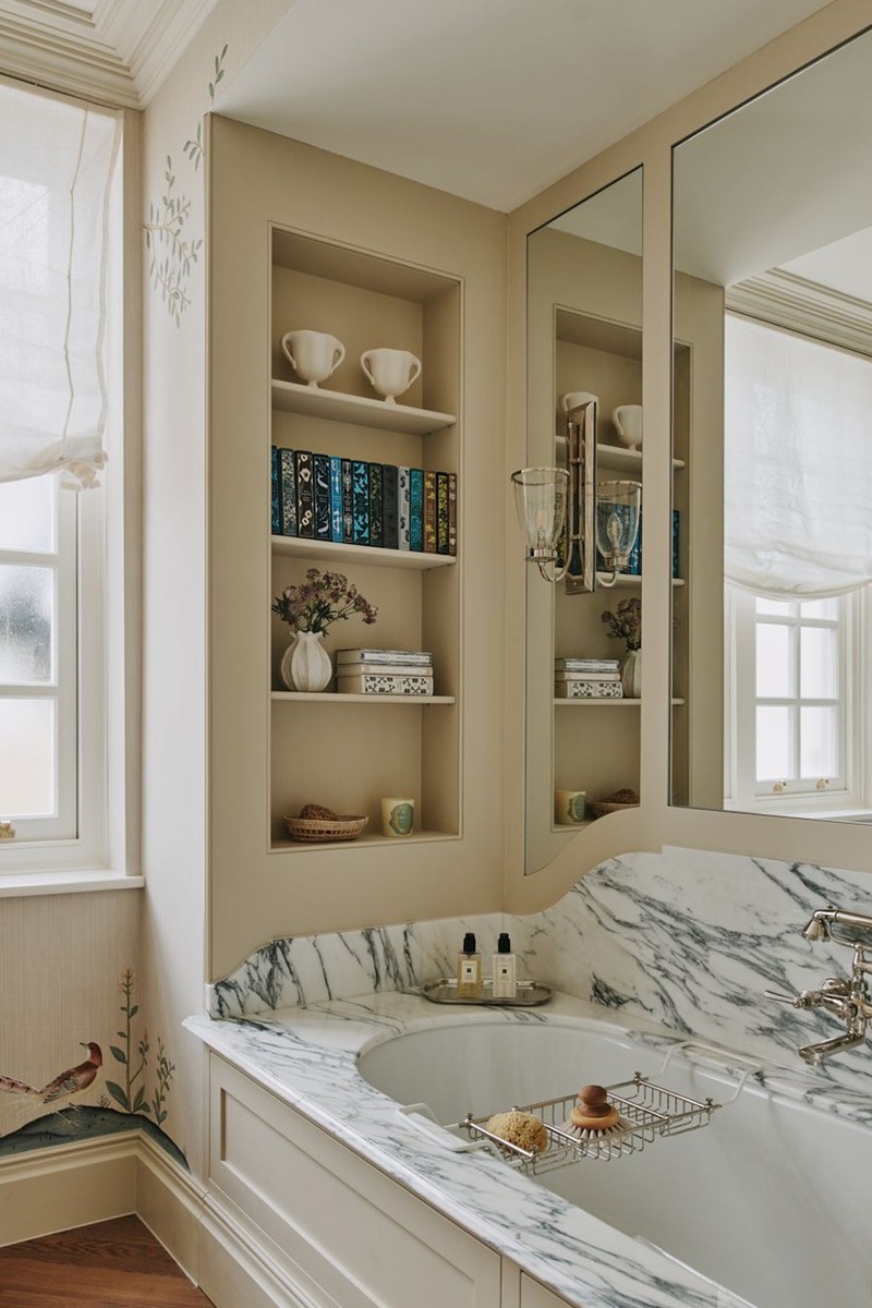 A study in quiet luxury, the ensuite features a sculptural curved marble bath and carefully layered detailing, classic in feel with a distinctly British sensibility.