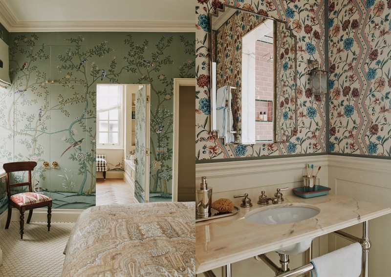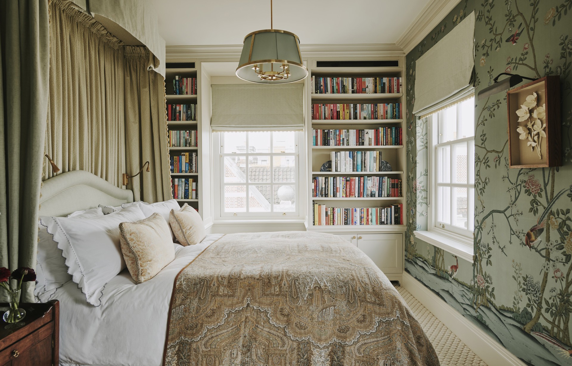 Wrapped entirely in a de Gournay wallpaper, the principal bedroom is immersive and cocooning. By continuing the pattern across walls, doors and joinery, multiple openings are concealed, creating a seamless finish.
