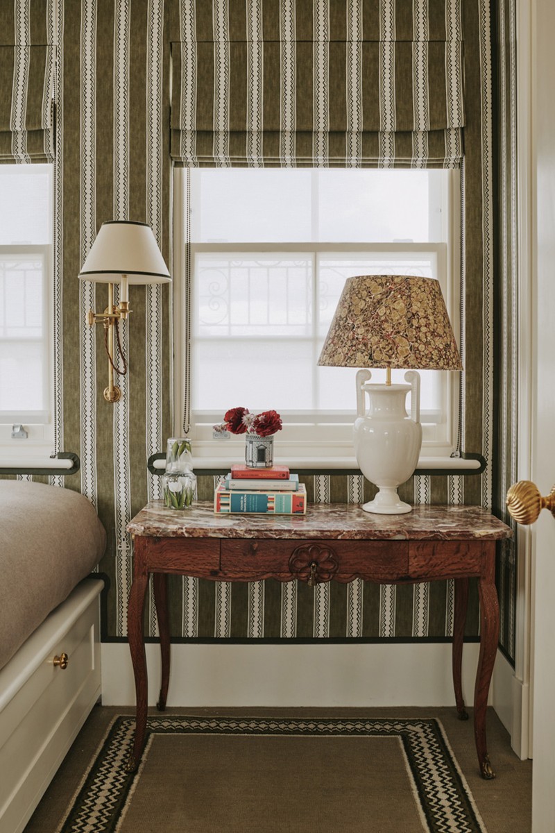 The guest bedroom is wrapped entirely in our Zig Zag Stripe design, with all walls upholstered in the wallpaper, and the same pattern echoed in the blinds and headboard fabric. Rather than overwhelming the space, this layered approach feels immersive and serene, creating a calm, cocoon-like atmosphere.