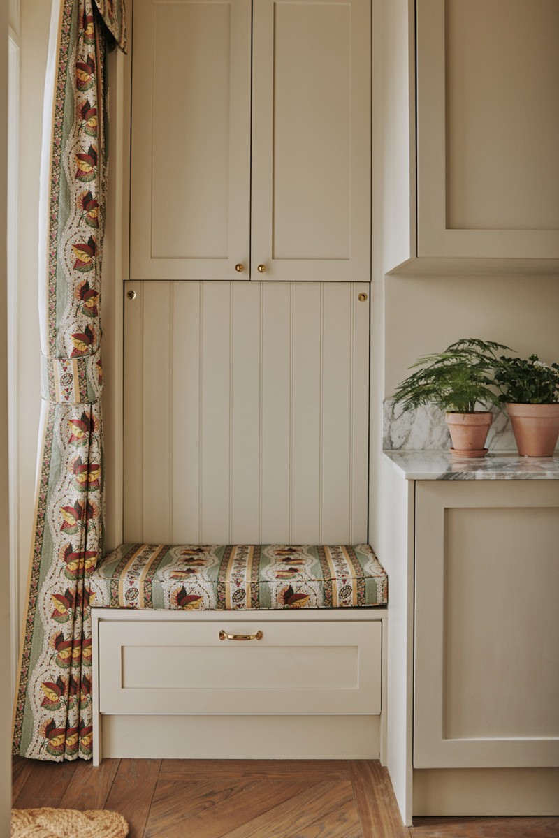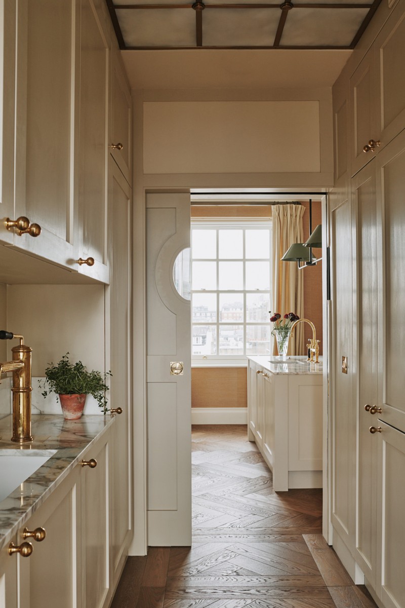 The adjoining pantry and coatroom receive the same level of attention as the principal rooms. A decorative glass ceiling introduces light and texture, while playful detailing elevates the practical.