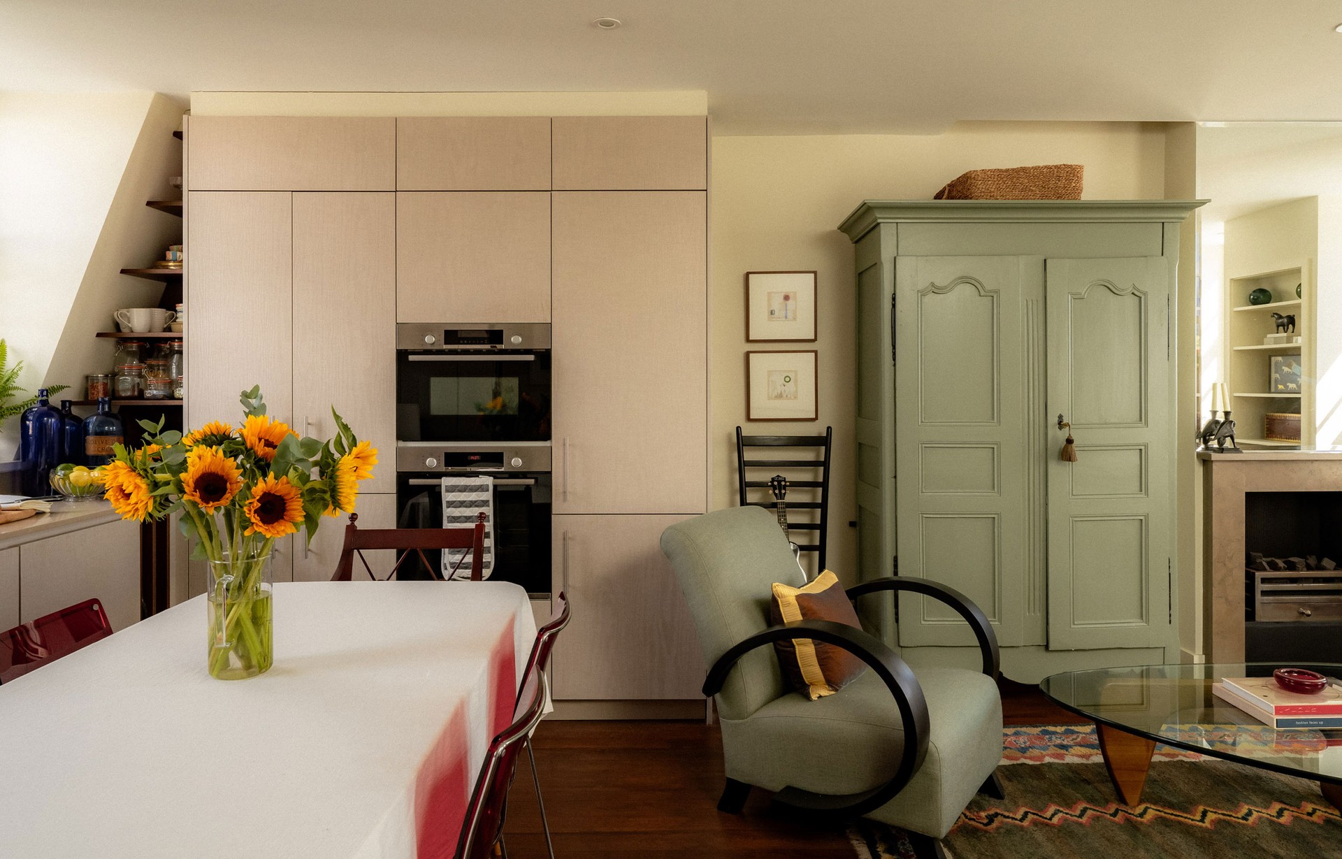 Zoning was also important – despite the small square footage, I knew I wanted a double-door pantry, so I worked with Kitchen Haus to create a discreet version to the left of the oven. The cabinetry is made from recycled material and finished to resemble linen-like fabric, which softens the overall look, and I added shelving in the eaves spaces to hold ceramics and Kilner jars, giving the space life and interest without cluttering it.